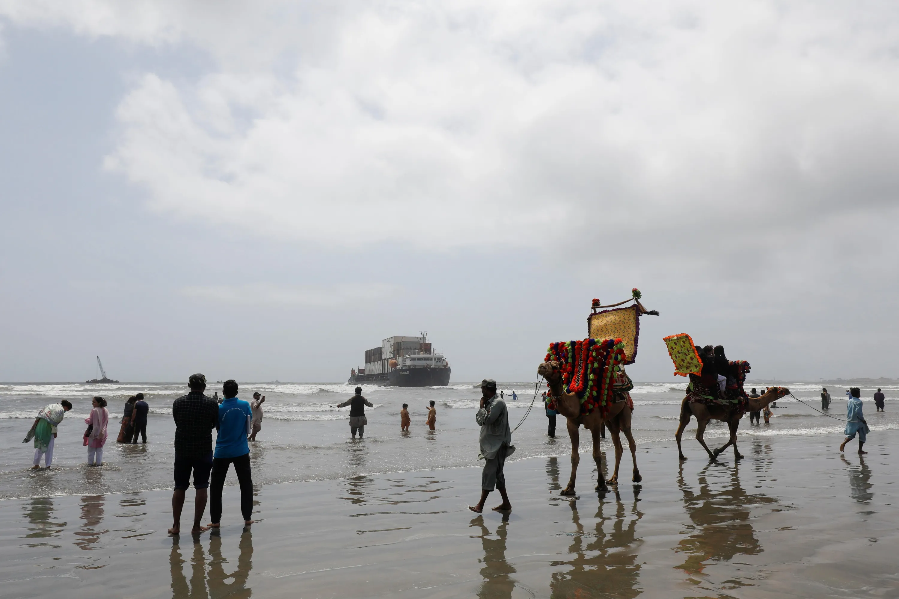 People look at the cargo ship Heng Tong 77 before it is dragged by a salvage crane, after it ran aground near Sea View beach in Karachi, Pakistan on August 24, 2021. (Photo by Akhtar Soomro/Reuters)