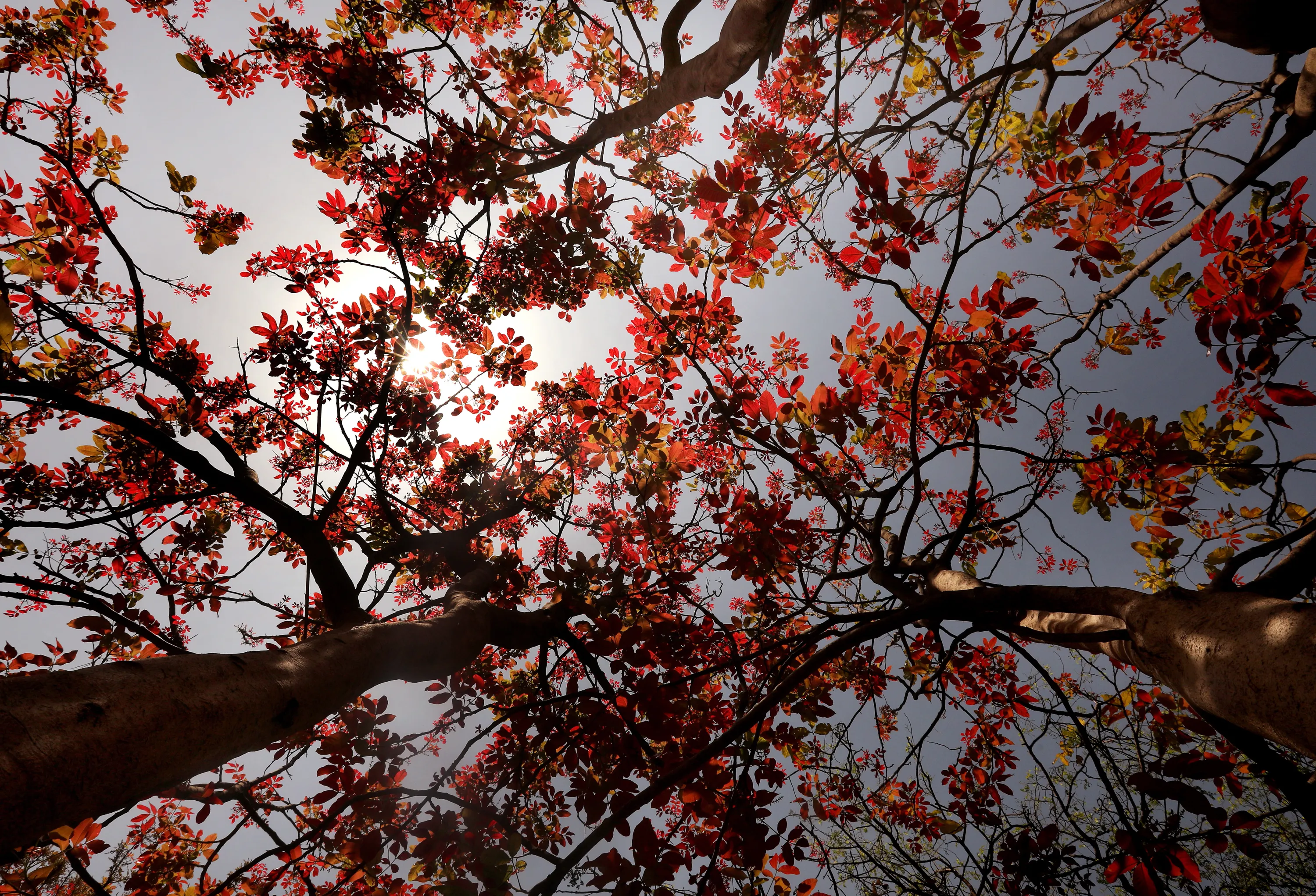 Trees with new red flushing leaves at Lodhi Gardens in New Delhi, India, 03 April 2019. According to the World Health Organization, Delhi has the worst air of any major city in the world but the Indian capital is still home to a plethora of striking trees and flowers, most of which are in full bloom in the spring season. Spring colors can be spotted among others at the city's landscaped roundabouts and public parks, like the Lodhi Gardens and Nehru Park that maintained by the Delhi's horticulture department, the New Delhi municipal council and local municipal corporations. (Photo by Harish Tyagi/EPA/EFE)
