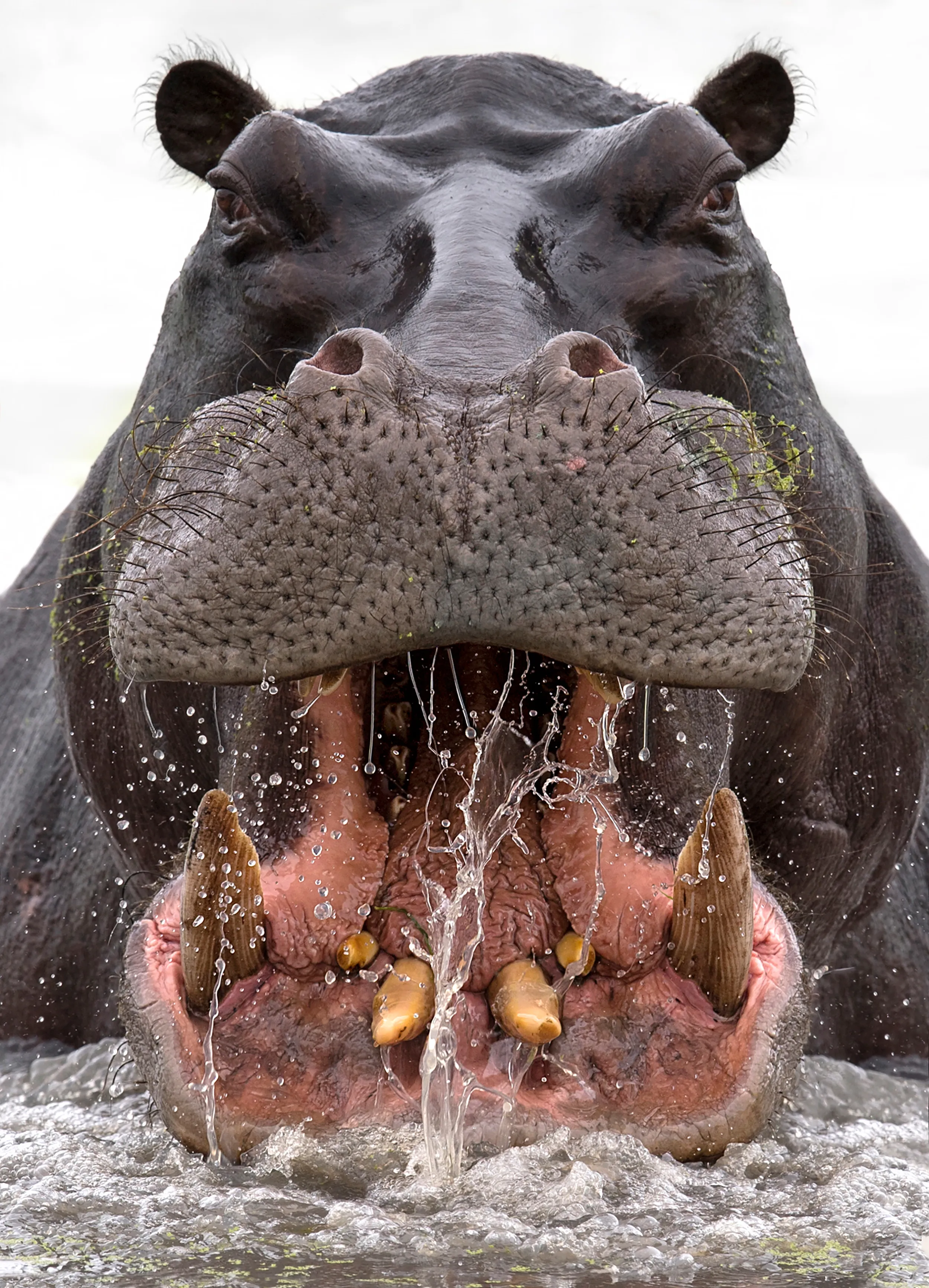 A male hippopotamus roars at the camera of wildlife photographer Dale Morris as he keeps his distance in a safari vehicle positioned behind a termite mound in the Okavango Delta, Botswana. Hippos are responsible for more than 500 deaths a year – far more than lions, tigers or bears. (Photo by Dale Morris/MediaDrumImages)
