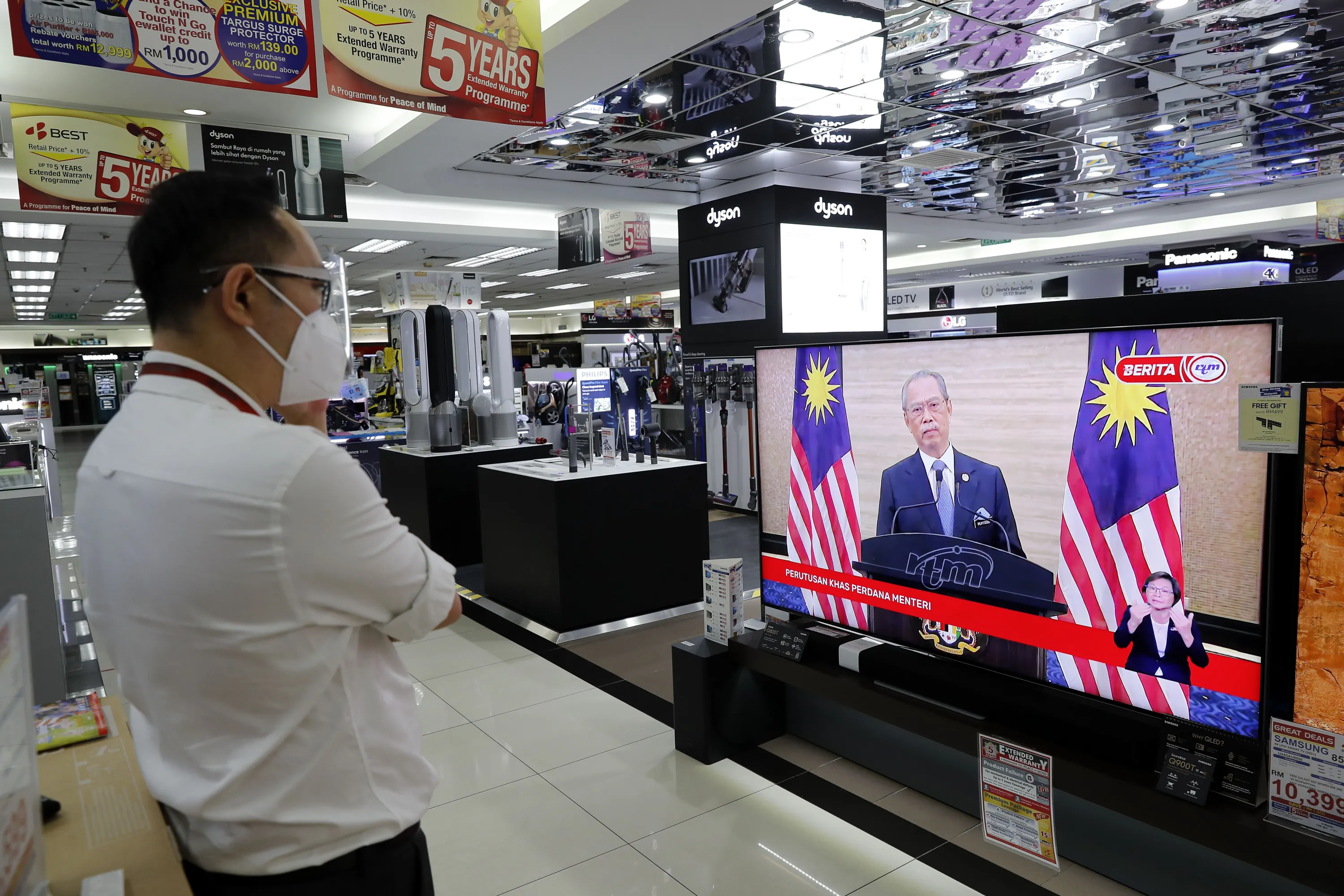An electronic shop staff wearing a face mask watches live broadcast of Malaysian Prime Minister Muhyiddin Yassin speak at a shopping outlet in Kuala Lumpur, Malaysia, Monday, August 16, 2021. Muhyiddin resigned less than 18 months into his tenure Monday, becoming the country's shortest-ruling leader after conceding that he lost majority support to govern. (Photo by F.L. Wong/AP Photo)