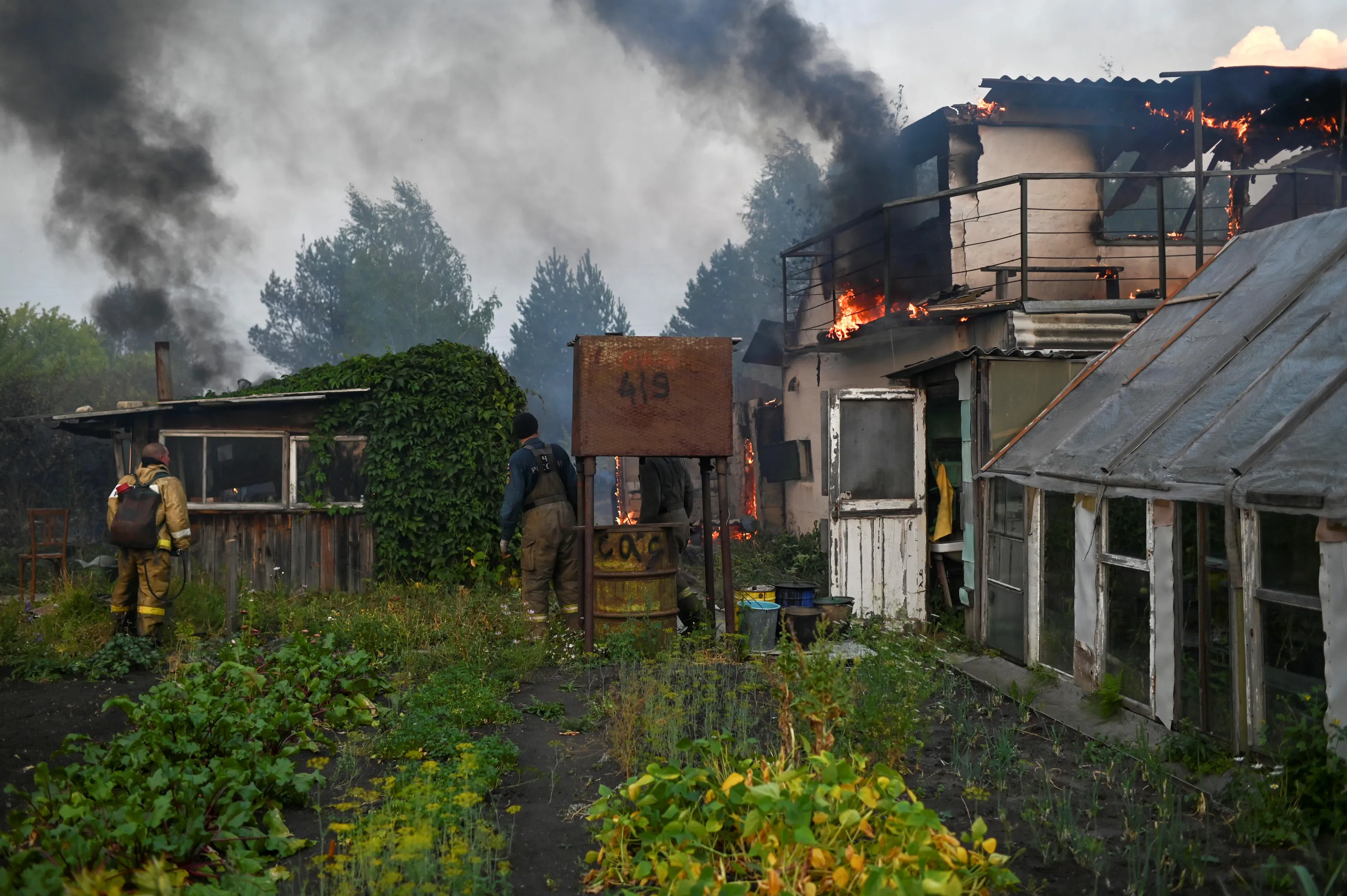 Members of Russia's Emergencies Ministry gather near a country house, which is on fire in a settlement affected by wildfires near the city of Kamensk-Uralsky in Sverdlovsk Region, Russia on August 25, 2021. (Photo by Alexey Malgavko/Reuters)