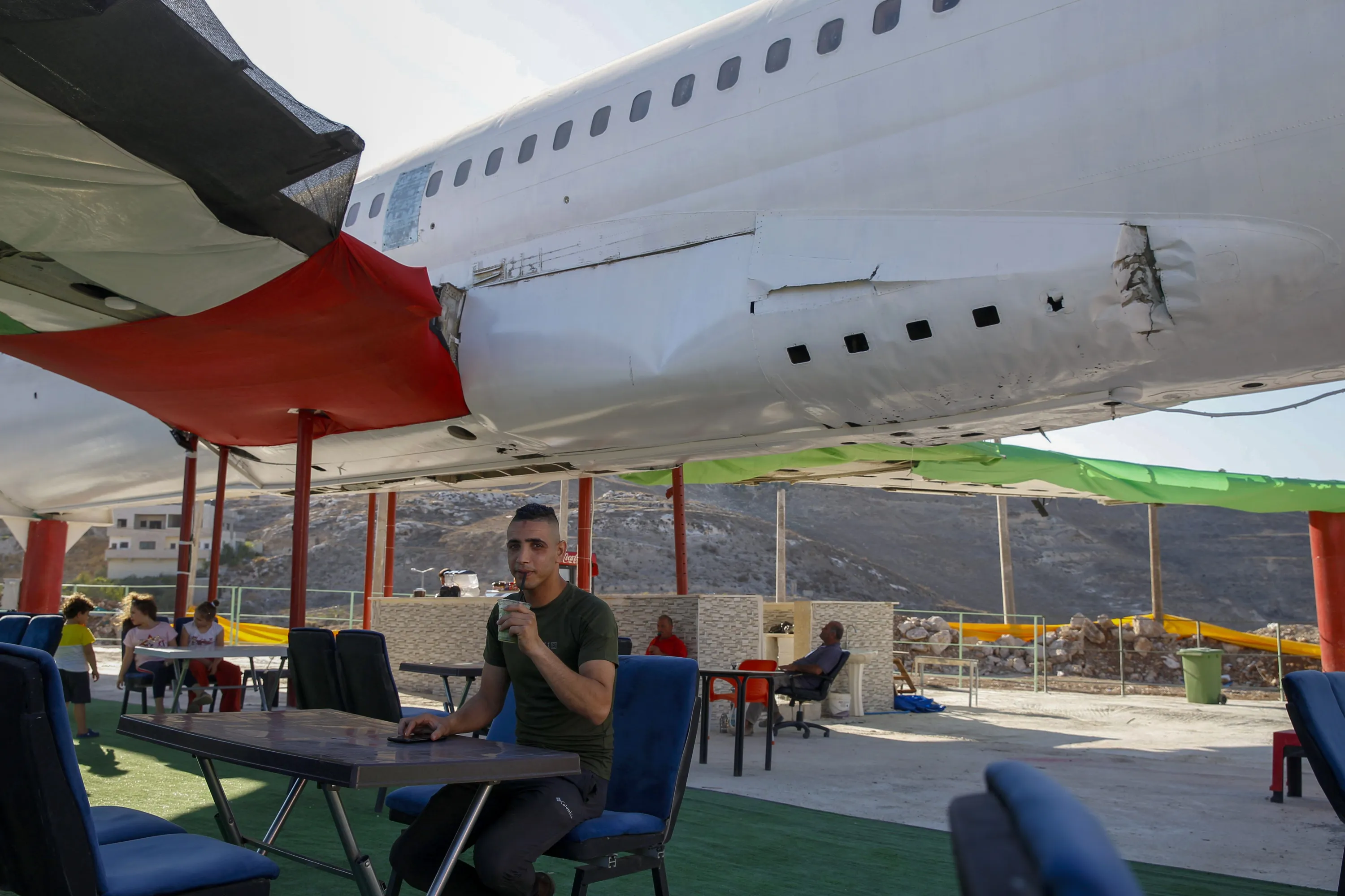 Palestinians visit a Boeing 707 aircraft after it was converted to a cafe restaurant, in Wadi Al-Badhan, near the West Bank city of Nablus, Wednesday, August 11, 2021. The Palestinian territory has no civilian airport and those who can afford a plane ticket must catch their flights in neighboring Jordan. After a quarter century of effort, twins brothers, Khamis al-Sairafi and Ata, opened the “Palestinian-Jordanian Airline Restaurant and Coffee Shop al-Sairafi” on July 21, 2021, offering people an old airplane for customers to board. (Photo by Majdi Mohammed/AP Photo)