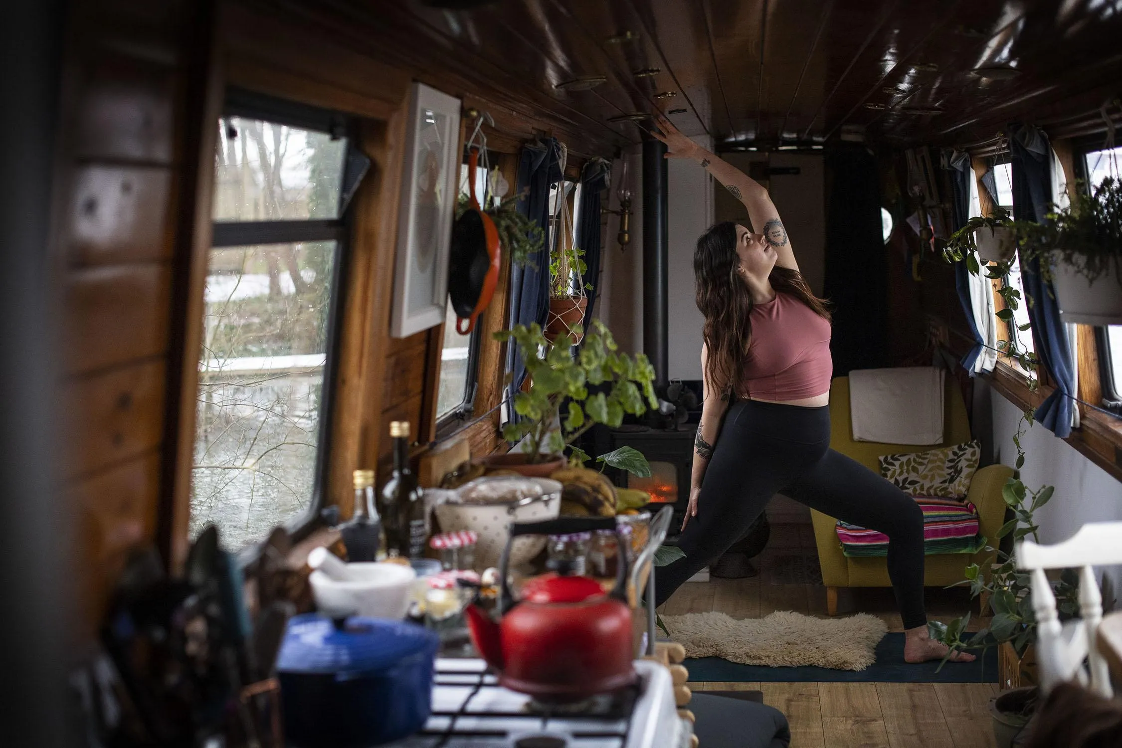 Yoga teacher Harriet McAtee, who is 6ft tall, performs a “Viparita Virabhadrasana” pose during a class on her 6ft wide narrowboat in Oxford. The Coronavirus pandemic has forced Harriet to conduct her classes via zoom video calls rather than face-to-face as she did pre-pandemic, but she now teaches to people all around the world, with students reaching as far as New Zealand. Issue date: Thursday February 18, 2021. (Photo by Victoria Jones/PA Images via Getty Images)