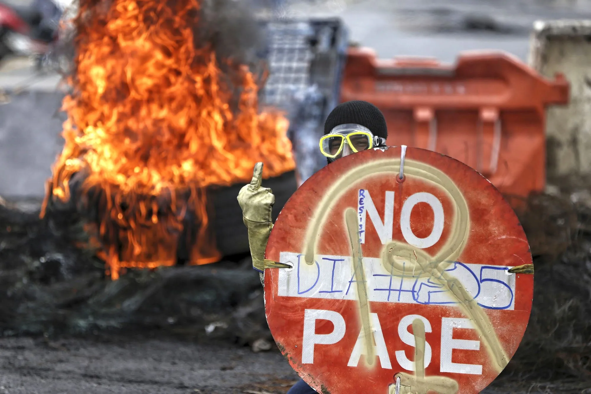 A protester protects himself with a traffic sign as he gestures obscenely at police during a national strike against tax reform in Cali, Colombia, Monday, May 3, 2021. Colombia's President Ivan Duque withdrew the government-proposed tax reform on Sunday. (Photo by Andres Gonzalez/AP Photo)
