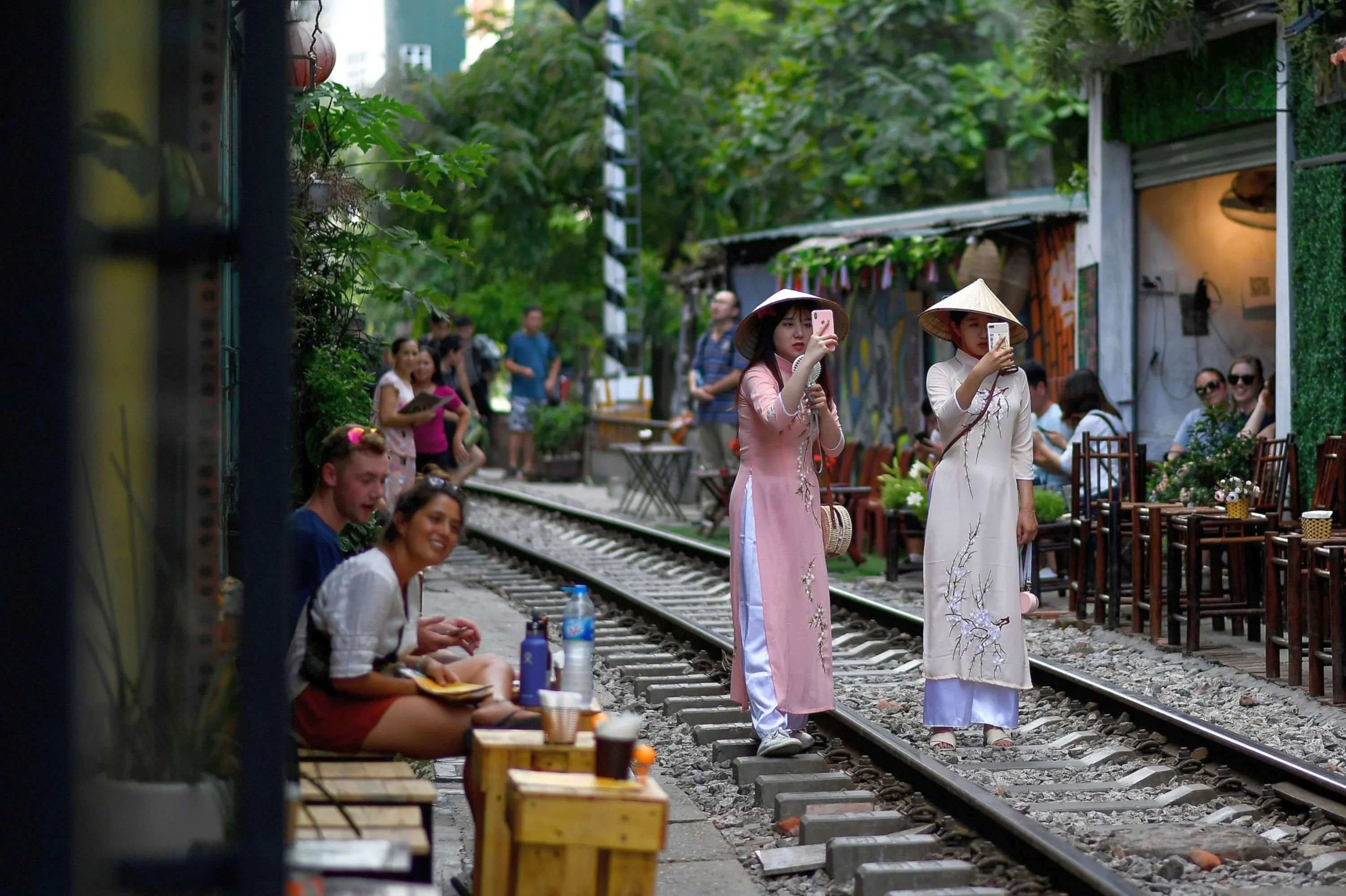 This photograph taken on June 9, 2019 shows women posing for a selfie on the railway track in Hanoi's popular train street. (Photo by Manan Vatsyayana/AFP Photo)