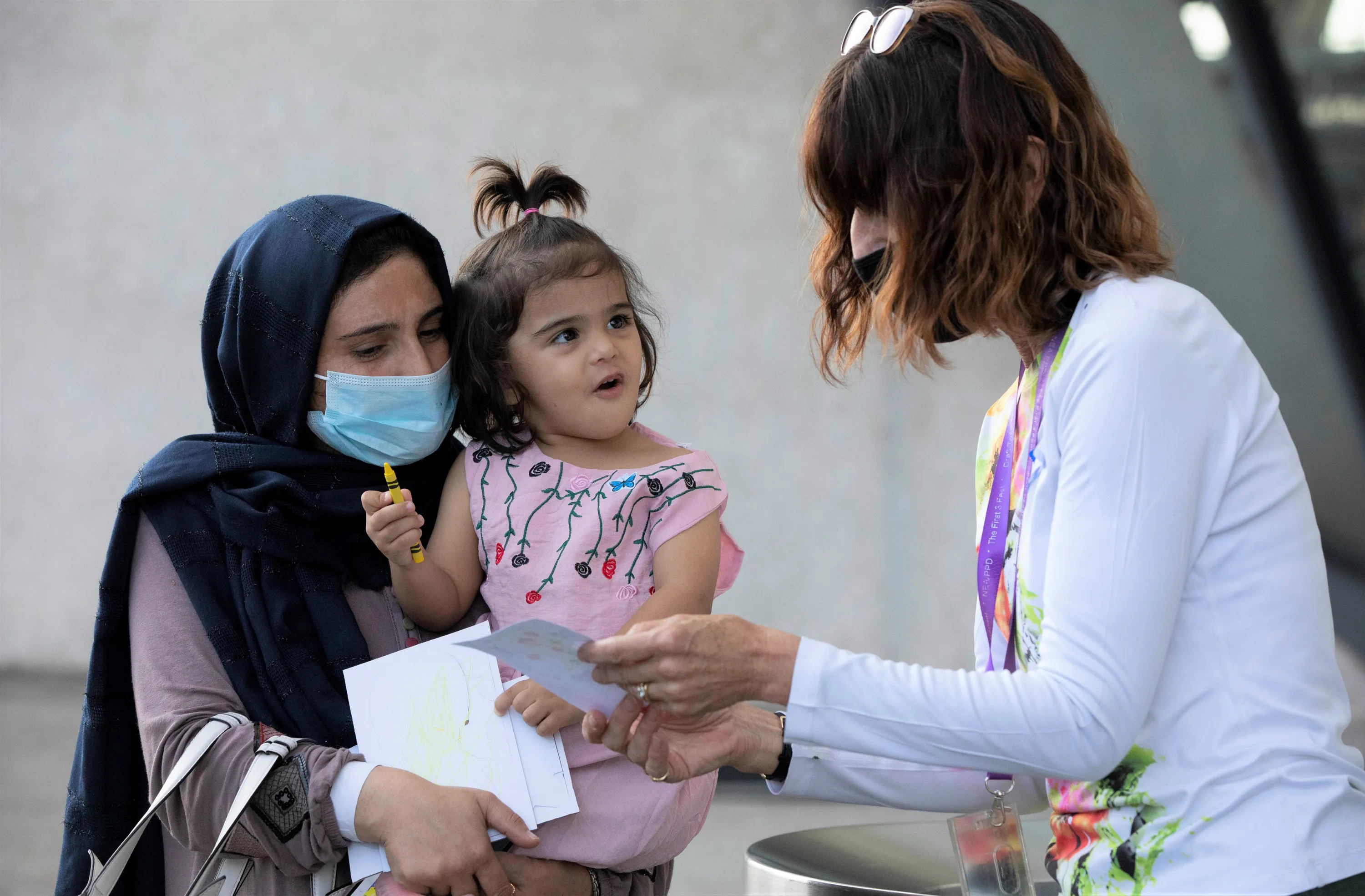 A volunteer interacts with a child evacuated from Kabul, Afghanistan at Washington Dulles International Airport, in Chantilly, Va., on Saturday, August 28, 2021. (Photo by Gemunu Amarasinghe/AP Photo)