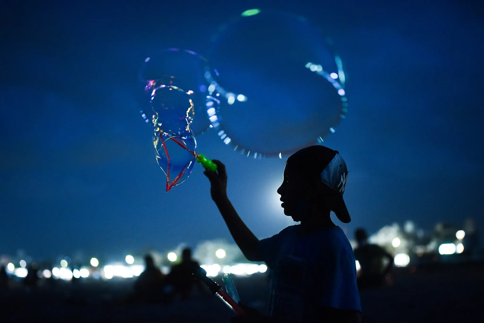 An Indian boy blows air bubbles to attract customers during sunset following the ease in COVID-19 lockdown restrictions, at Elliot's beach in Chennai, India, 31 August 2021. Tamil Nadu state government eases ongoing lockdown restrictions as it allows theatres, parks and beaches to reopen following a marginal drop in COVID-19 cases in the state. (Photo by Idrees Mohammed/EPA/EFE)