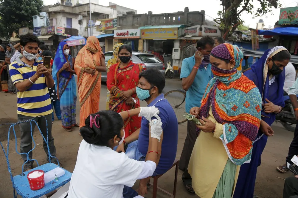 A health worker administers the vaccine for COVID-19 during a vaccination drive in Ahmedabad, India, Tuesday, August 31, 2021. (Photo by Ajit Solanki/AP Photo)