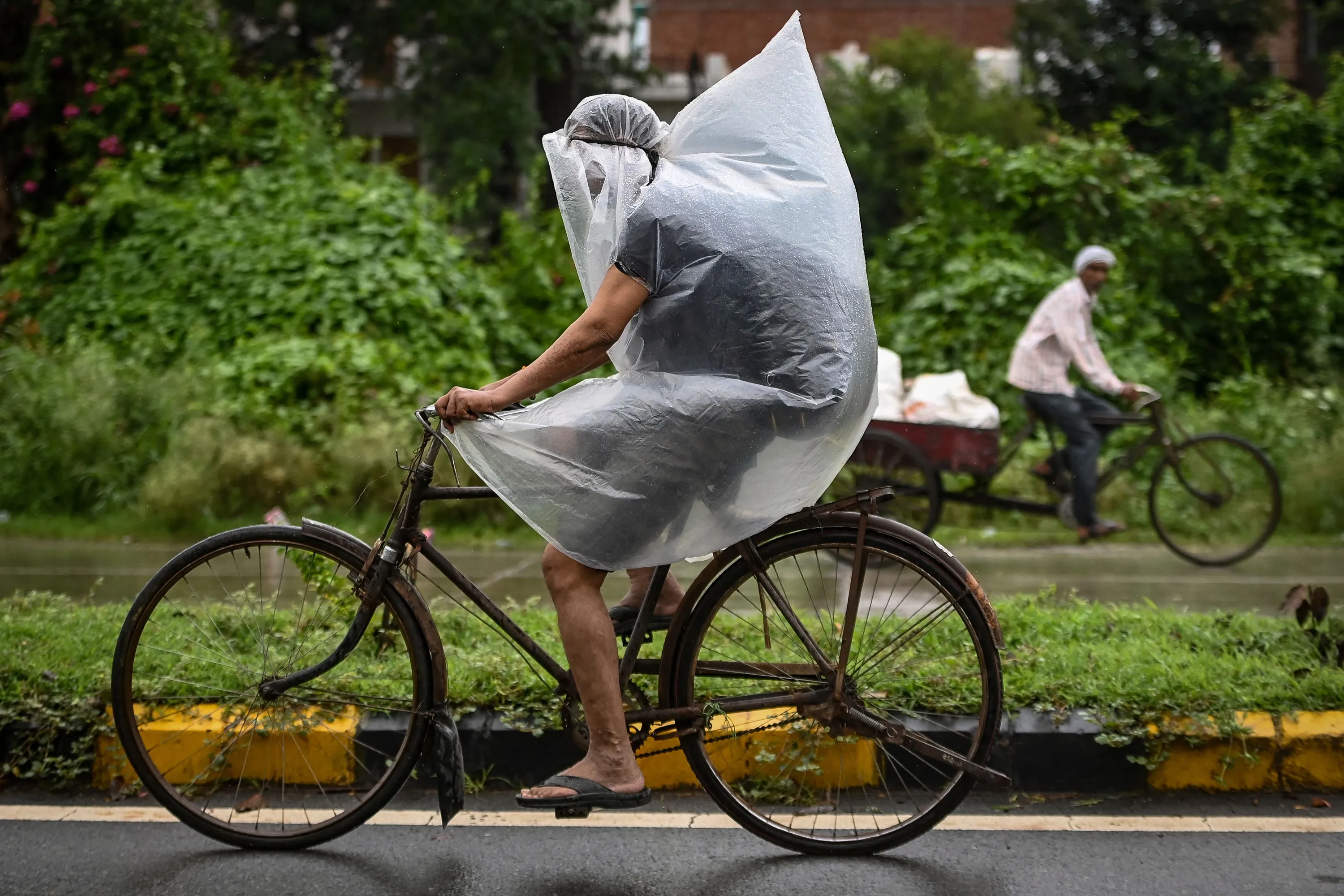 A cyclist covers himself with a plastic sheet during a downpour in Faridabad on September 1, 2021. (Photo by Money Sharma/AFP Photo)