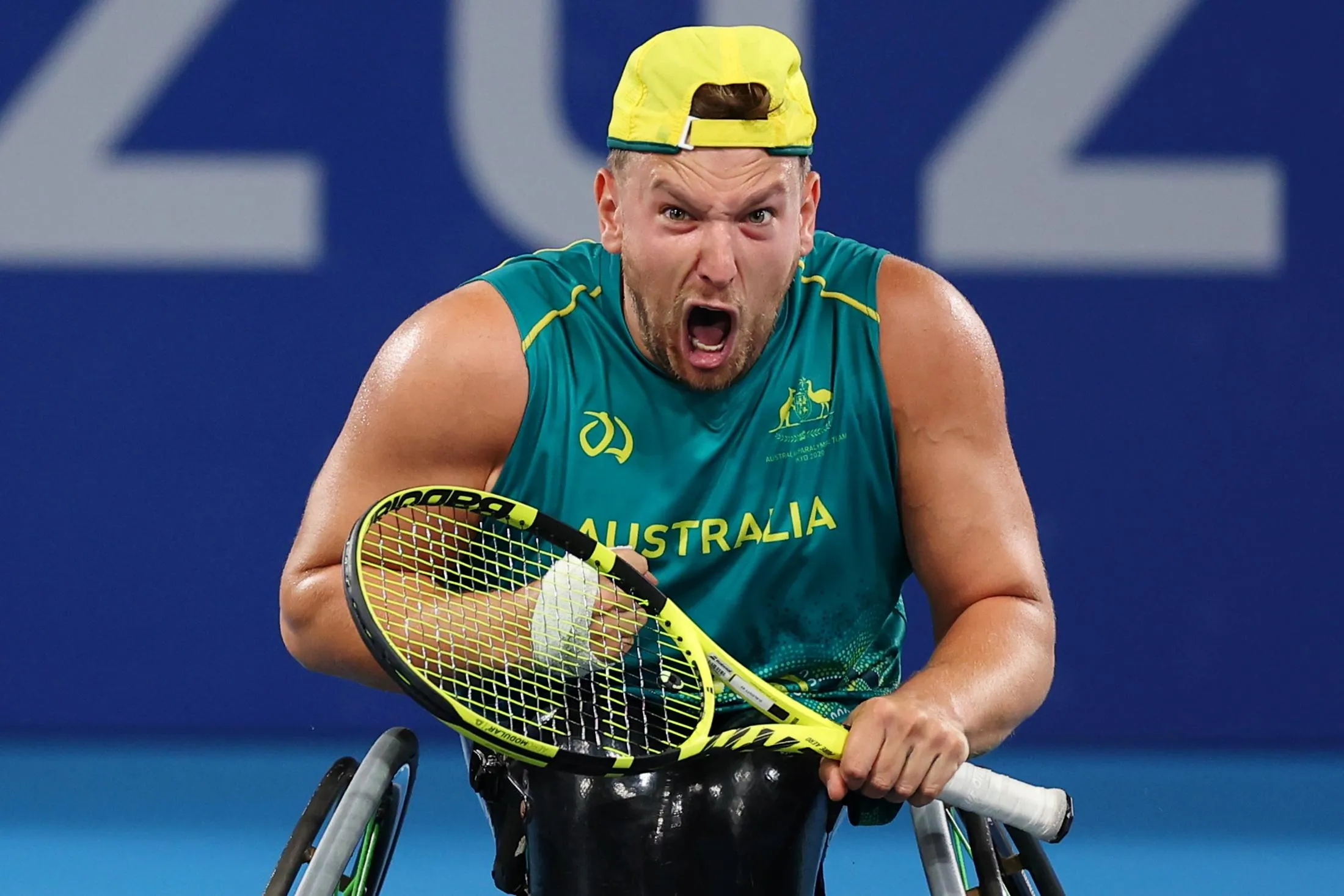 Dylan Alcott of Australia celebrates winning his match against Niels Vink of the Netherlands in wheelchair tennis quad singles semifinals at Ariake Tennis Park in Tokyo, Japan on August 31, 2021. (Photo by Thomas Peter/Reuters)