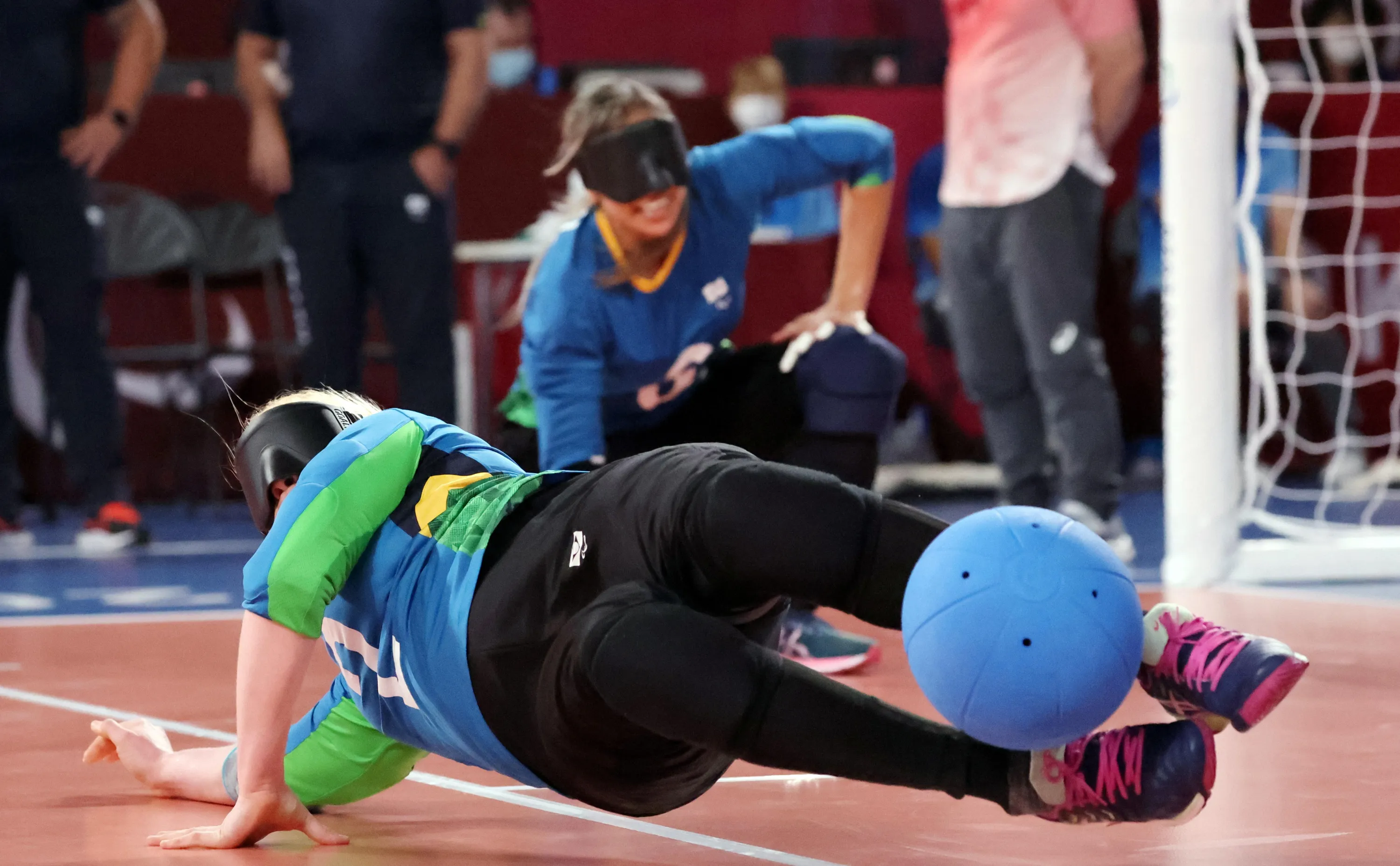 Ana Gabriely Brito Assuncao of Brazil in action in women's goalball quarterfinals against China at Makuhari Messe Hall C in Chiba, Japan on September 1, 2021. (Photo by Ivan Alvarado/Reuters)
