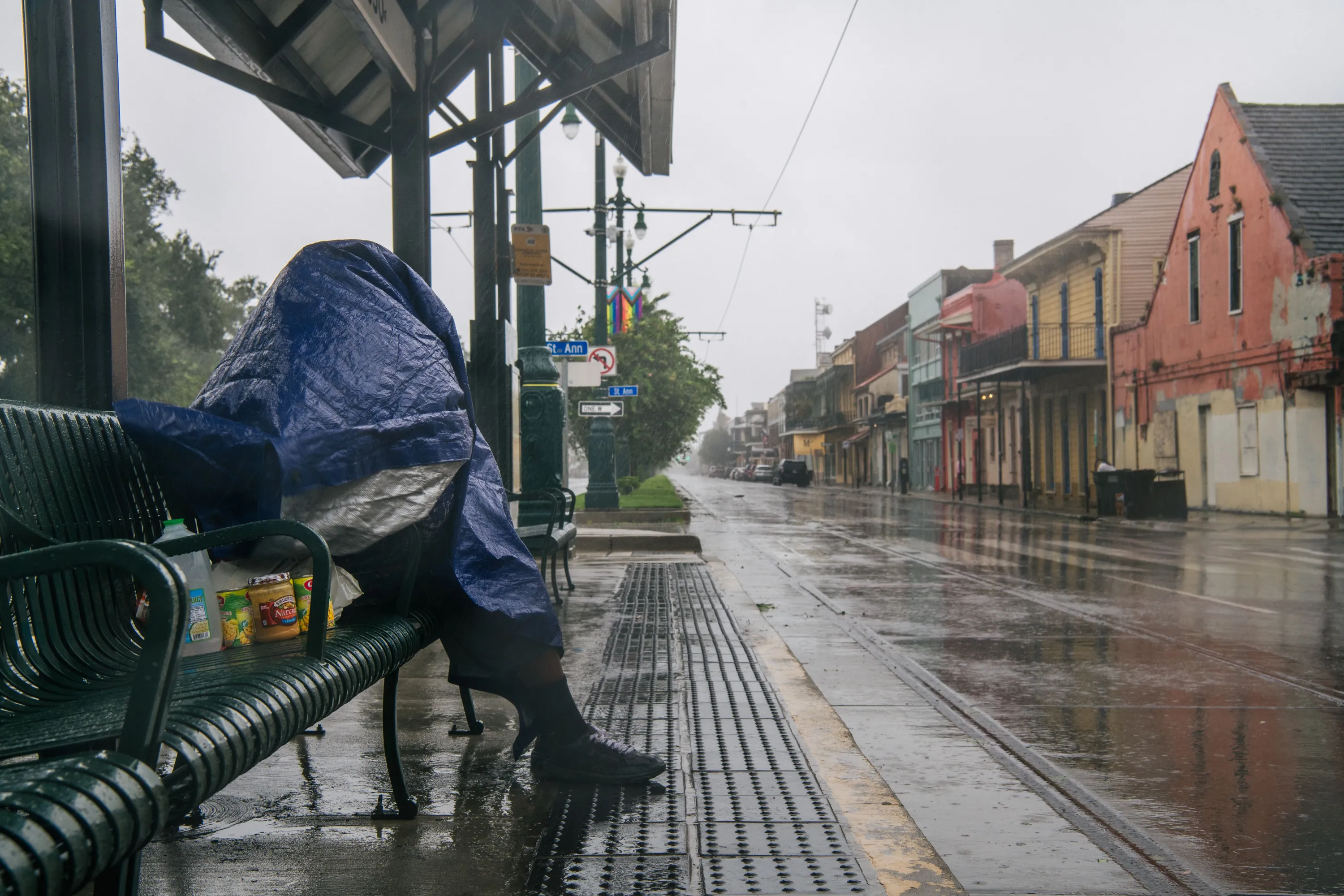 A person sits at a train stop for shelter ahead of Hurricane Ida on August 29, 2021 in New Orleans, Louisiana. Residents of New Orleans continue to prepare as the outer bands of the hurricane begin to cut across the city. Ida is expected to make landfall as a Category 4 storm later today. (Photo by Brandon Bell/Getty Images)