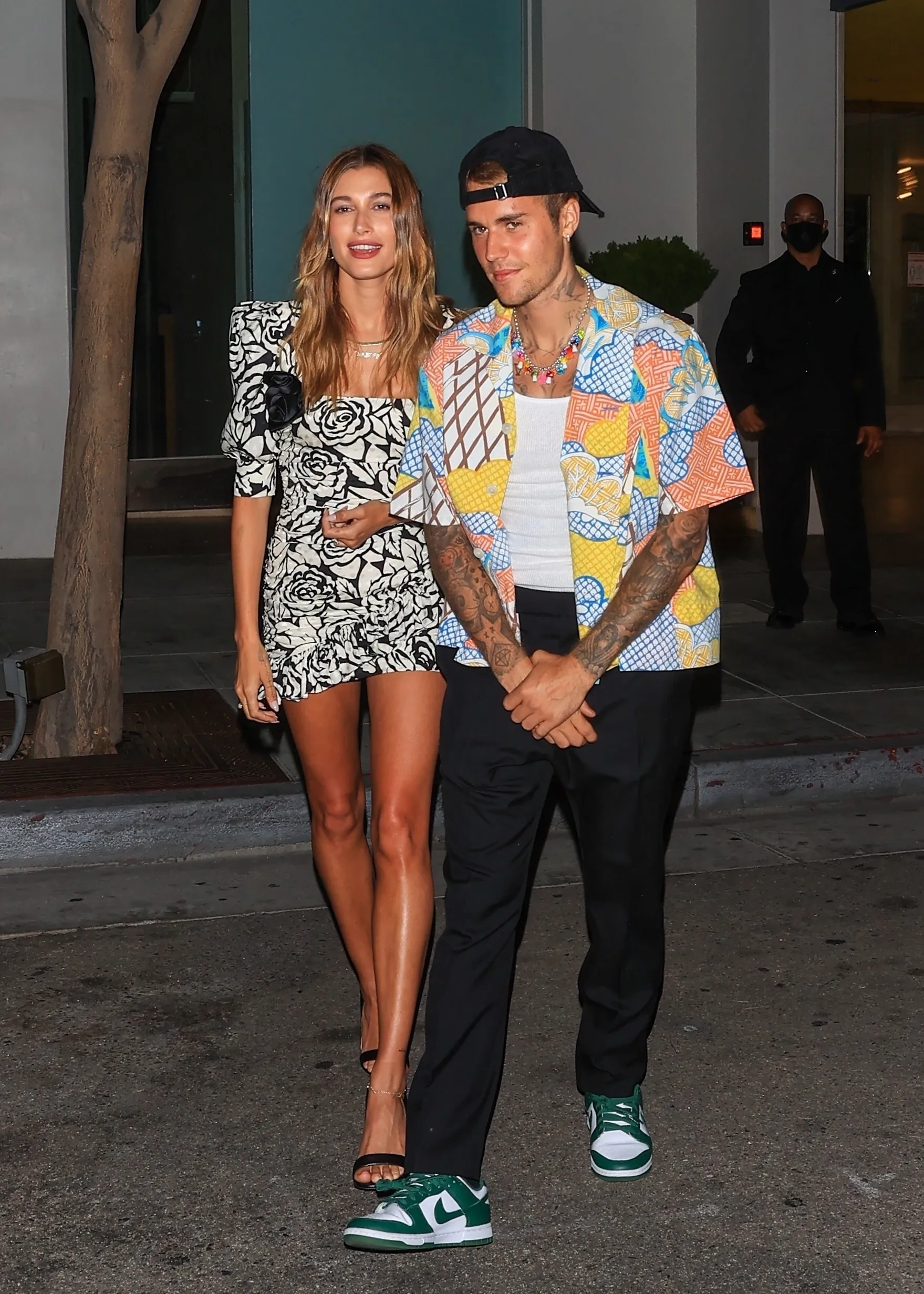 Justin and Hailey Bieber are all smiles after enjoying a dinner date at Spago in Beverly Hills, CA on August 24, 2021. (Photo by Backgrid USA)