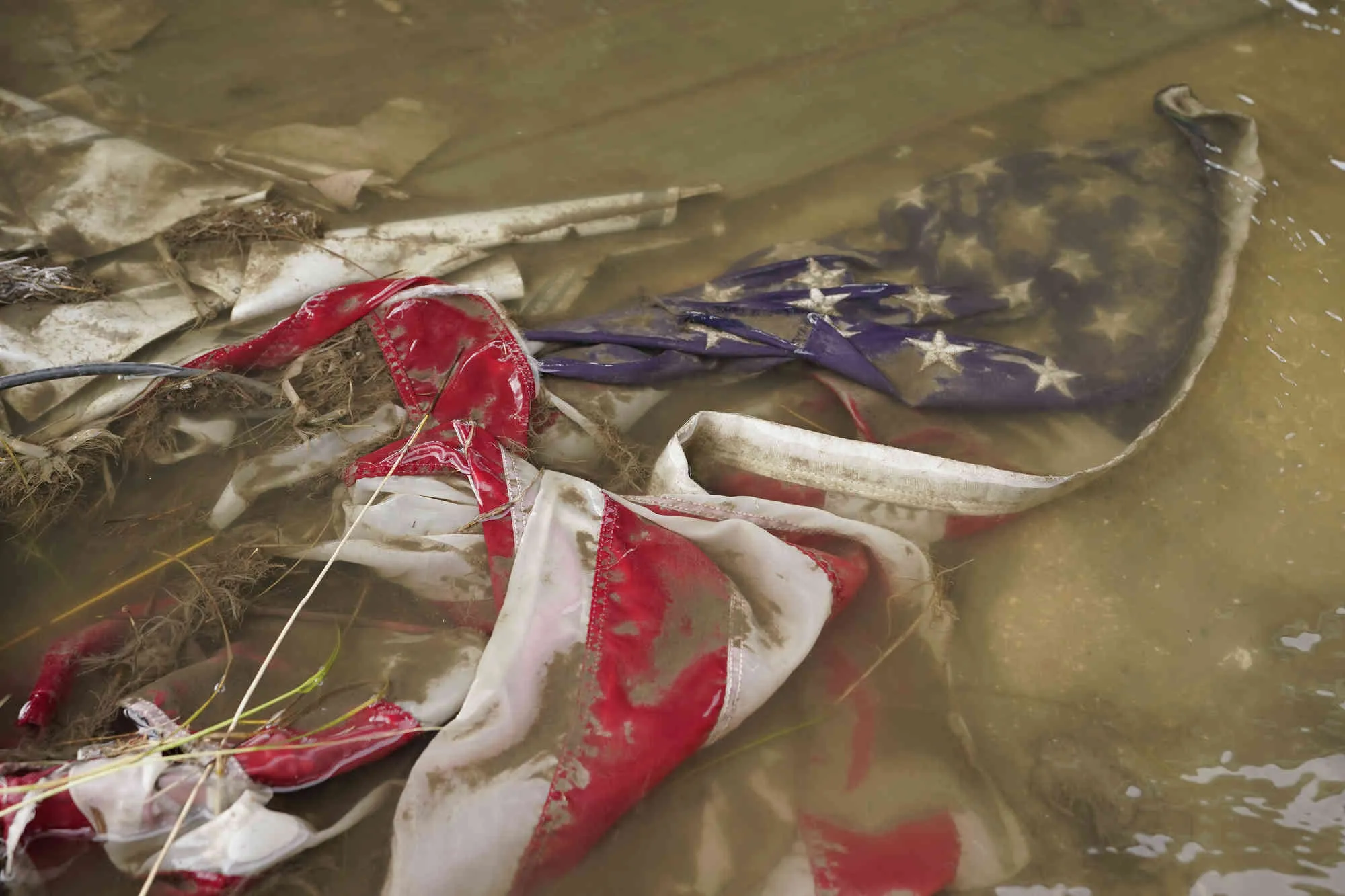 In the aftermath of Hurricane Ida, an American flag floats in a puddle of flood water Wednesday, September 1, 2021, in Myrtle Grove, La. (Photo by Steve Helber/AP Photo)