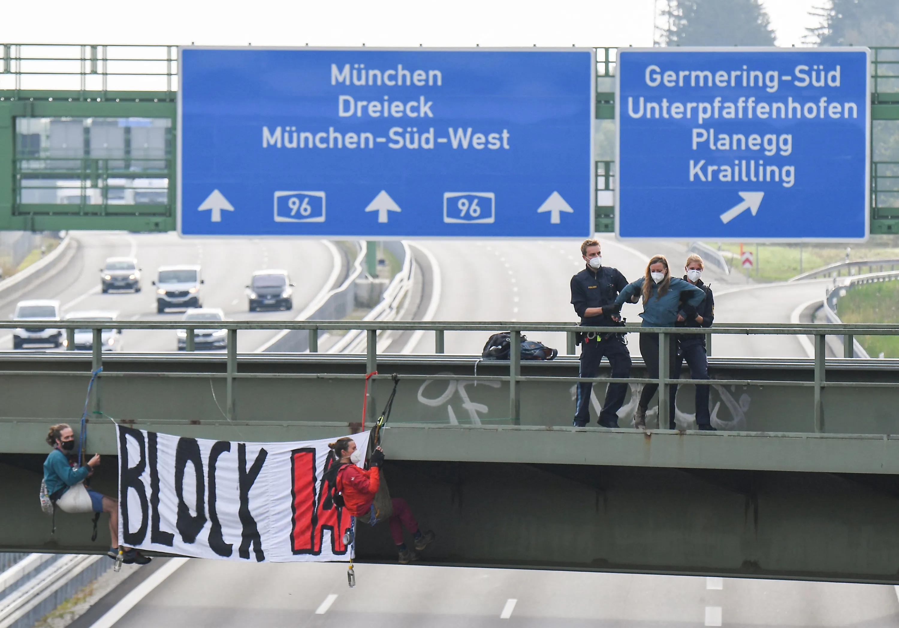 Police detain a climate activist of Extinction Rebellion who were abseiling from a bridge over a motorway near Munich with a banner reading “Block IAA” in order to block the access to the International Motor Show (IAA) held in Munich, southern Germany, on September 7, 2021. Germany's revamped IAA auto show, one of the world's largest, officially opened in Munich for a celebration of all things car-related, but climate concerns and pandemic woes threaten to spoil the party. (Photo by Tobias Schwarz/AFP Photo)