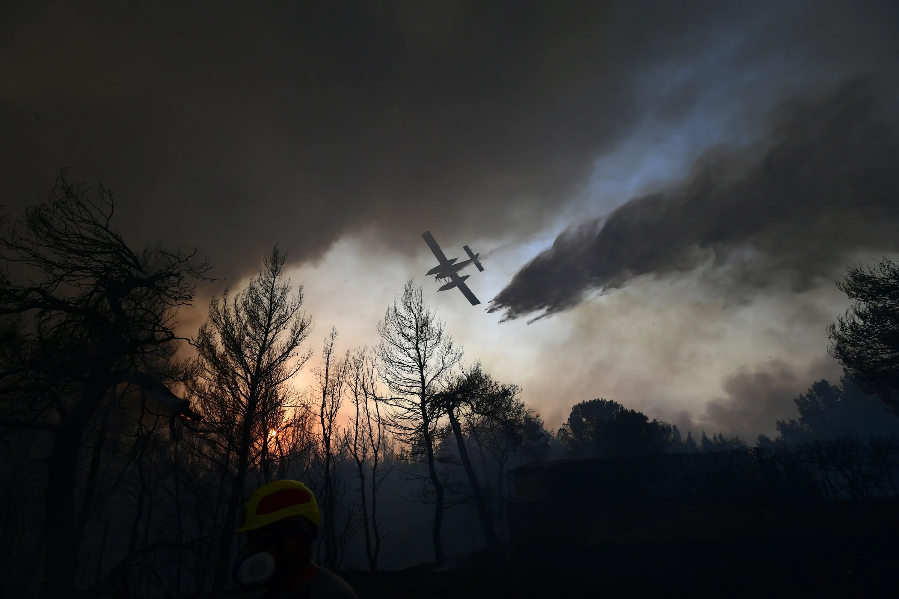 An aircraft drops water during a wildfire in Kryoneri area, northern Athens, Greece, Thursday, August 5, 2021. (Photo by Michael Varaklas/AP Photo)