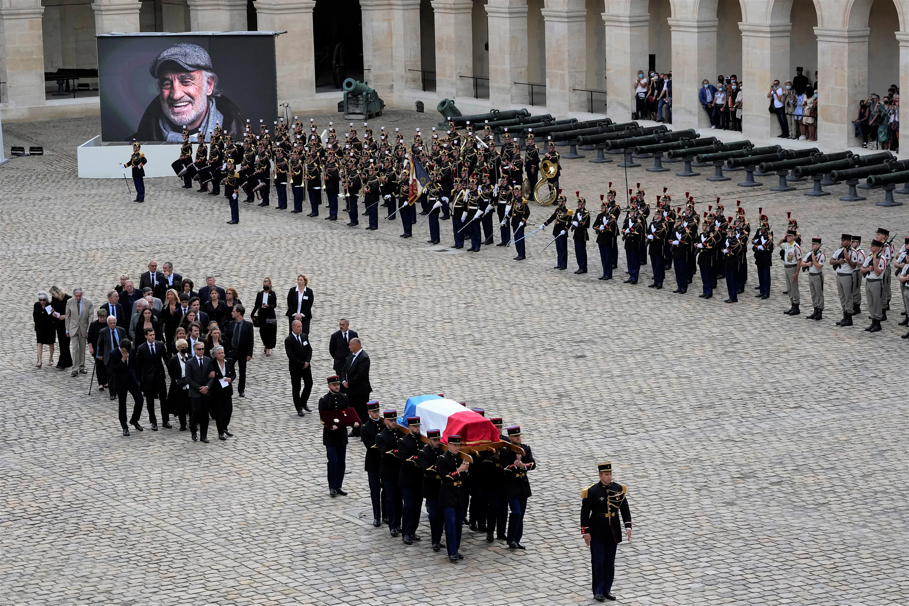 Republican Guards carry the coffin of Jean-Paul Belmondo after a tribute ceremony for the late French actor at the Hotel des Invalides, Thursday, September 9 2021 in Paris. The tributes for the star of iconic French New Wave film “Breathless” reflect his prominent role in France's cultural world and in living rooms, where families gathered around his films. Belmondo, whose crooked boxer's nose and rakish grin made him one of the country's most recognizable leading men, died at 88 earlier this week. (Photo by Michel Euler/AP Photo)