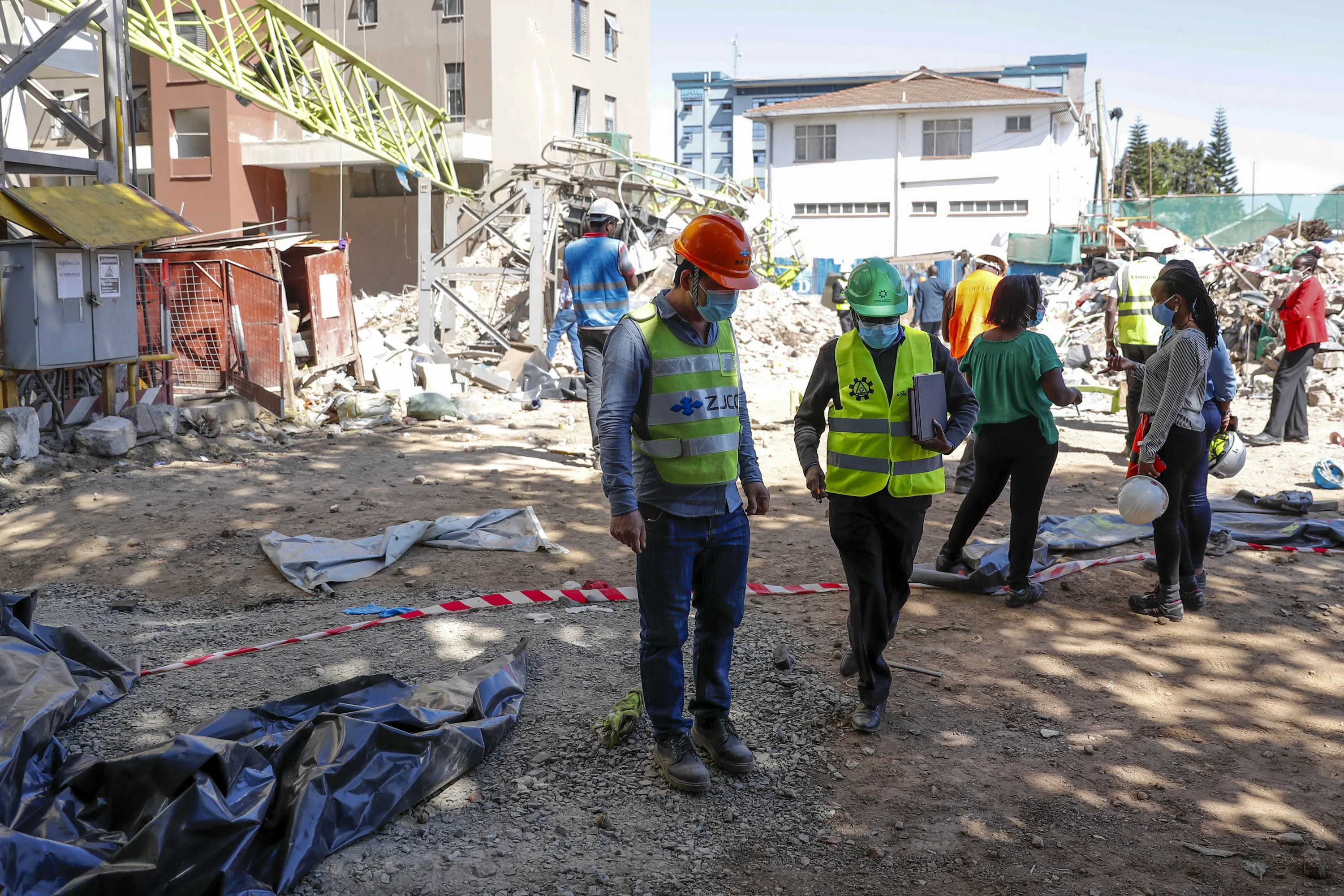 Construction workers observe the wreckage after a crane collapsed at a construction project to build a 14-storey student hostel in Nairobi, Kenya, Thursday, August 26, 2021. Police in Kenya's capital say nine people are dead, including two Chinese engineers, after the crane collapsed at the site being supervised by a Chinese construction firm. (Photo by Brian Inganga/AP Photo)
