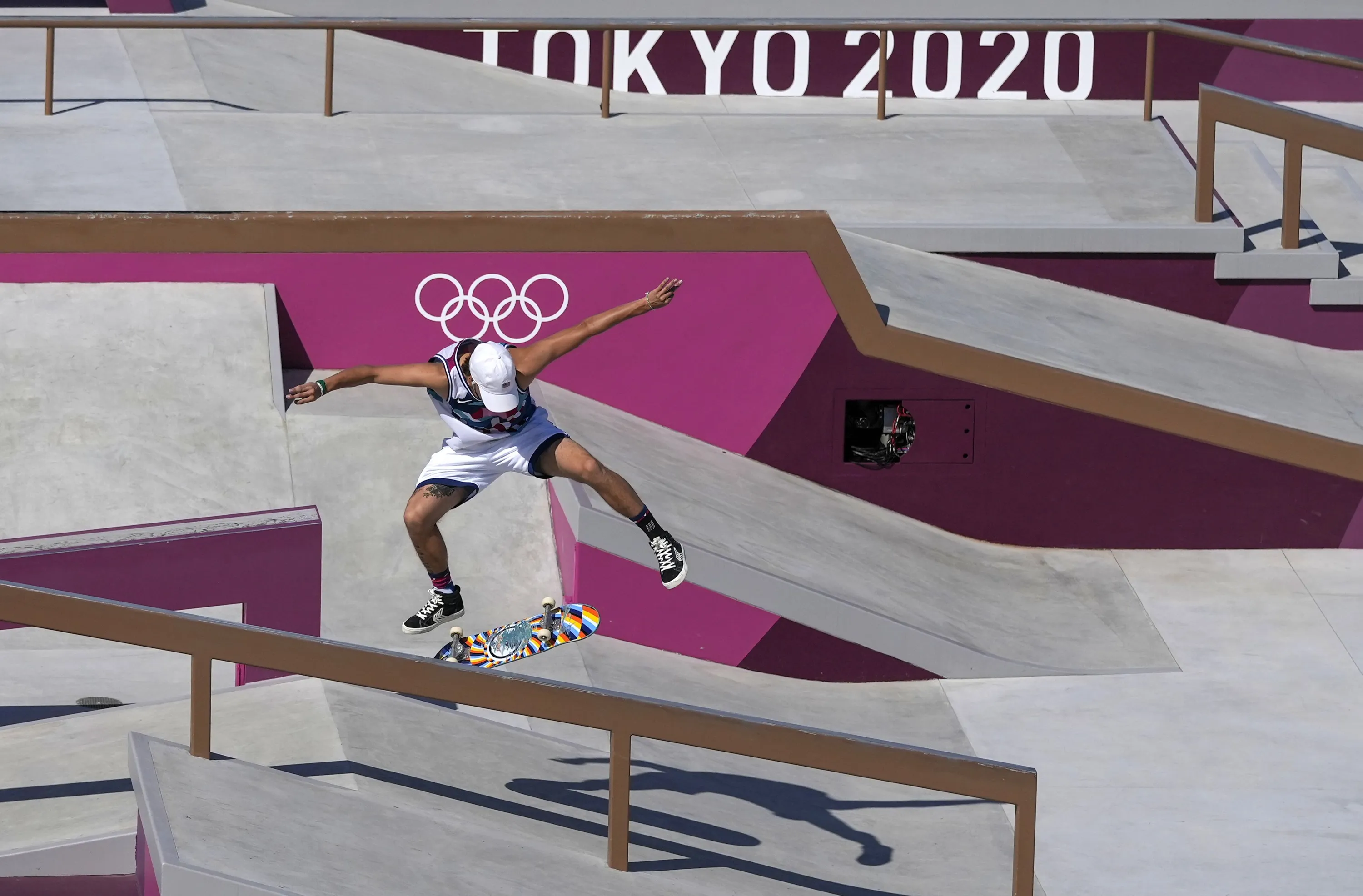 United States skateboarder Jagger Eaton performs a trick during one of his preliminary runs during the the Men's Street Skateboarding event of the Tokyo 2020 Olympic Games at Ariake Urban Sports Park on Sunday, July 25. 2021. Eaton won a Bronze medal in the first Olympic skateboarding event. (Photo by Toni L. Sandys/The Washington Post)