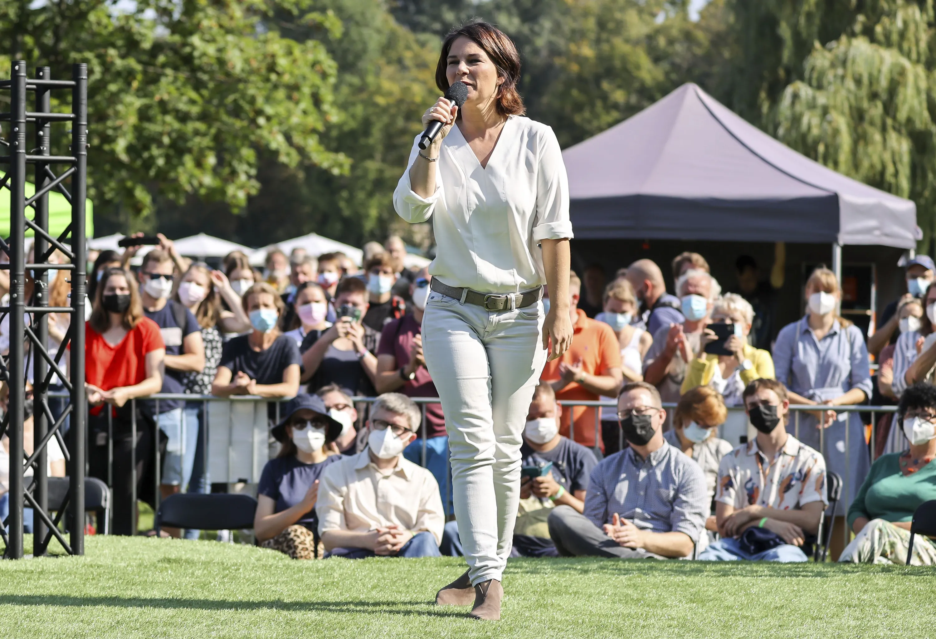 The candidate for chancellor of the German Green party, Annalena Baerbock, speaks during an election campaign event in Halle near Leipzig, Germany, Wednesday, September 8, 2021. Climate change is among the top concerns for Germans going into this year's national election that will determine who replaces Angela Merkel as Chancellor. But while voters admit they are worried about the state of the planet, especially after last the deadly floods that hit Germany in July, many fear the cost of backing the environmentalist Green party that's campaigned strongest for meeting the Paris climate accord's goals. (Photo by Jan Woitas/dpa via AP Photo)