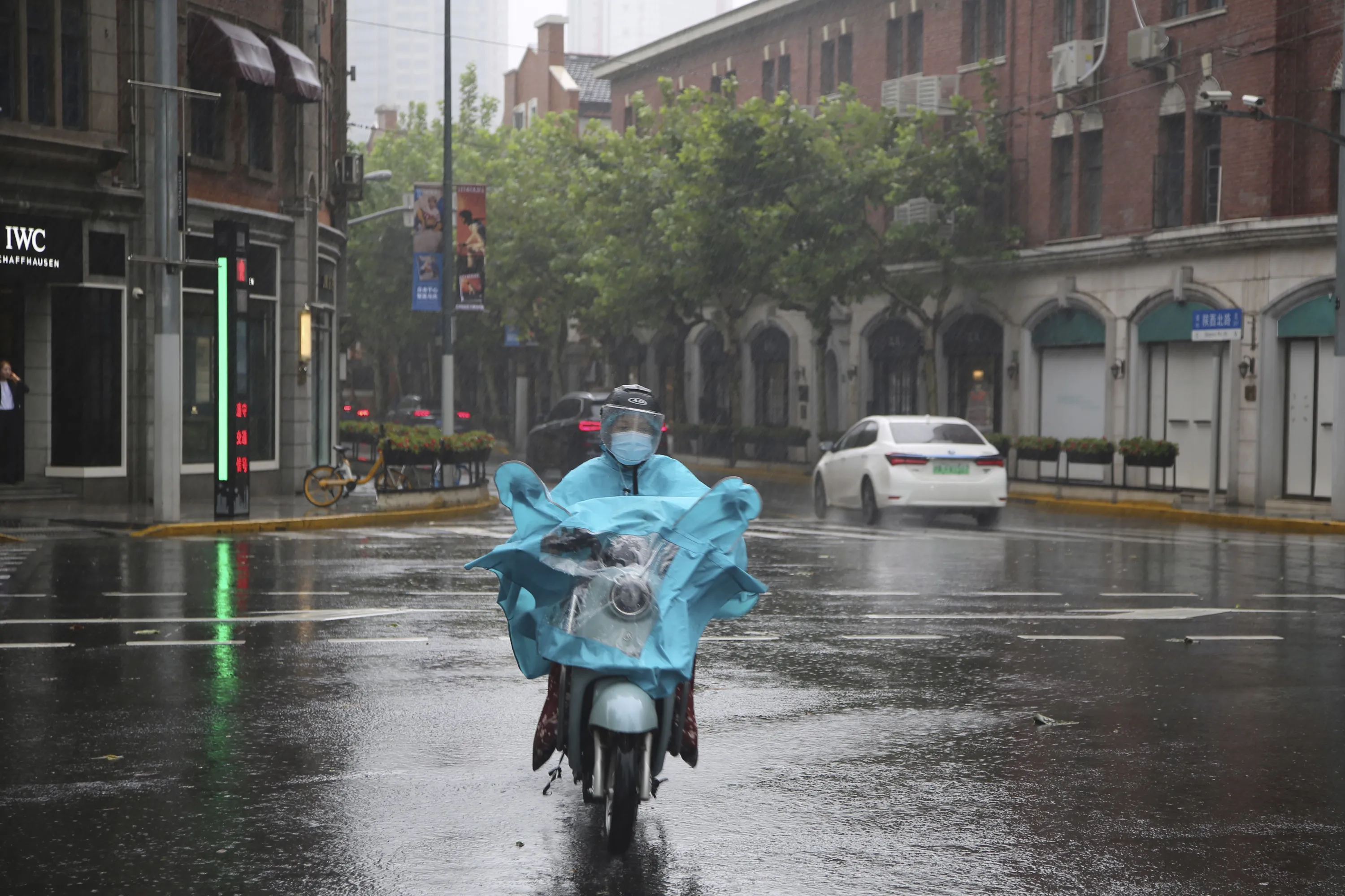 A resident wearing a mask and rain gear rides on the street as it rains in Shanghai, China, Monday, September 13, 2021. (Photo by Chen Si/AP Photo)