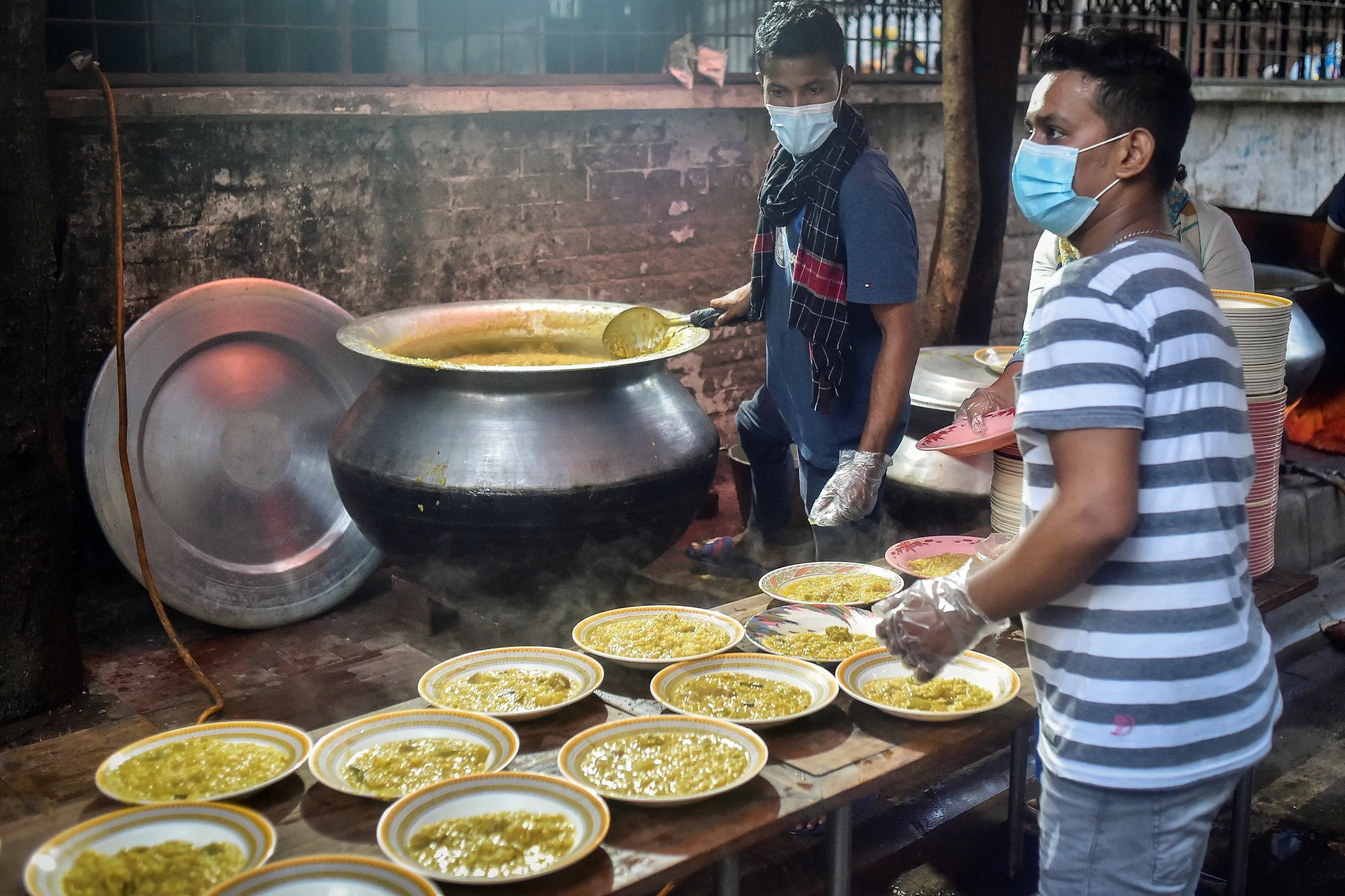 This picture taken on July 26, 2021 shows volunteer from Mehmankhana, a non-profit organization, preparing food for pandemic affected people during a lockdown to contain the spread of the Covid-19 coronavirus, at Lalmatia area. (Photo by Munir Uz Zaman/AFP Photo)
