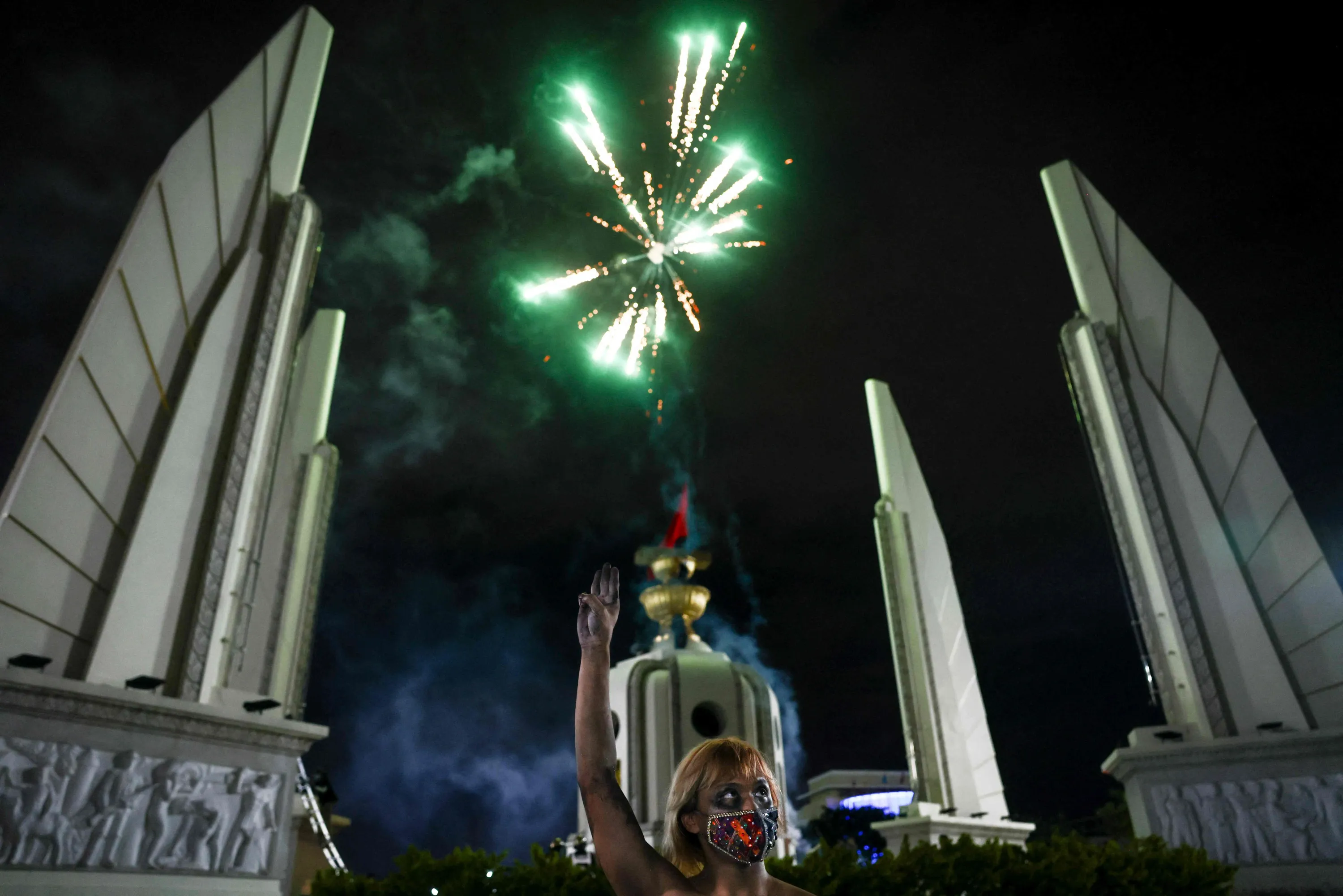 A protester flashes a three finger salute as fireworks explode over the Democracy Monument during a demonstration calling for the resignation of Thailand's Prime Minister Prayut Chan-O-Cha over the government's handling of the Covid-19 coronavirus crisis in Bangkok on August 28, 2021. (Photo by Jack Taylor/AFP Photo)