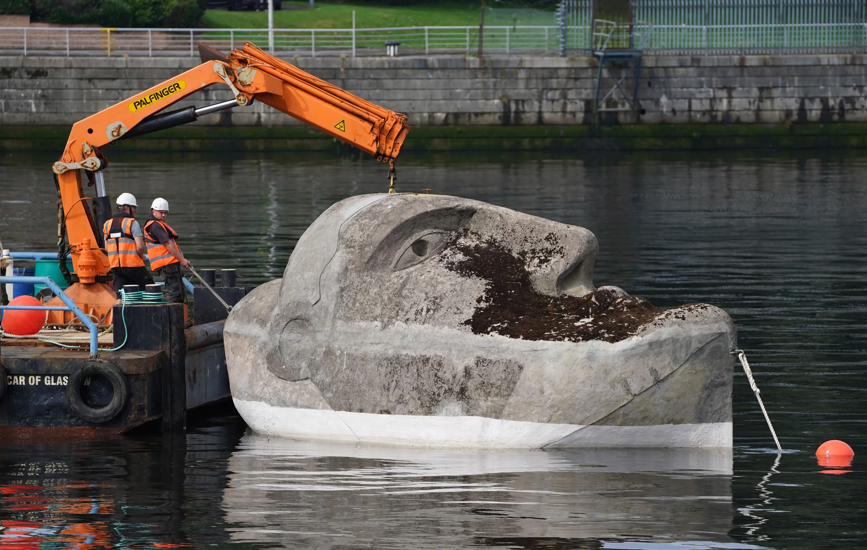 The 27-tonne concrete and steel Floating Head sculpture by artist Richard Groom is moved into position on the River Clyde near the Glasgow Science Centre on Monday, August 23, 2021, some 33 years after it was created for the Glasgow Garden Festival. (Photo by Andrew Milligan/PA Images via Getty Images)