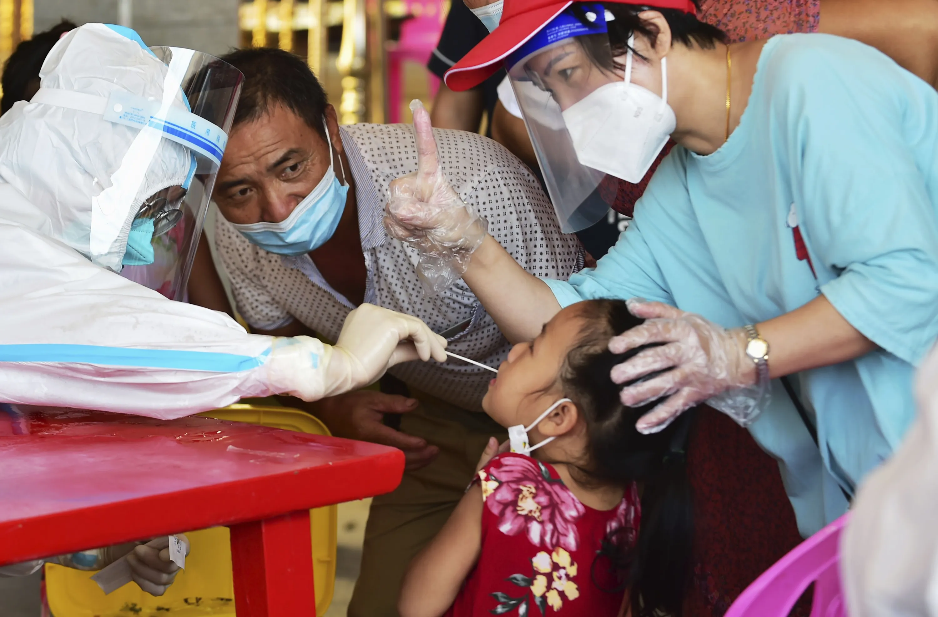 In this photo released by Xinhua News Agency, a health worker collects swab sample from a girl for nucleic acid testing in Xianyou county, Putian city, southeastern China's Fujian Province Thursday, September 16, 2021. China has reported another 62 cases of COVID-19, even as the number of Chinese citizens fully vaccinated has topped 1 billion. (Photo by Wei Peiquan/Xinhua via AP Photo)