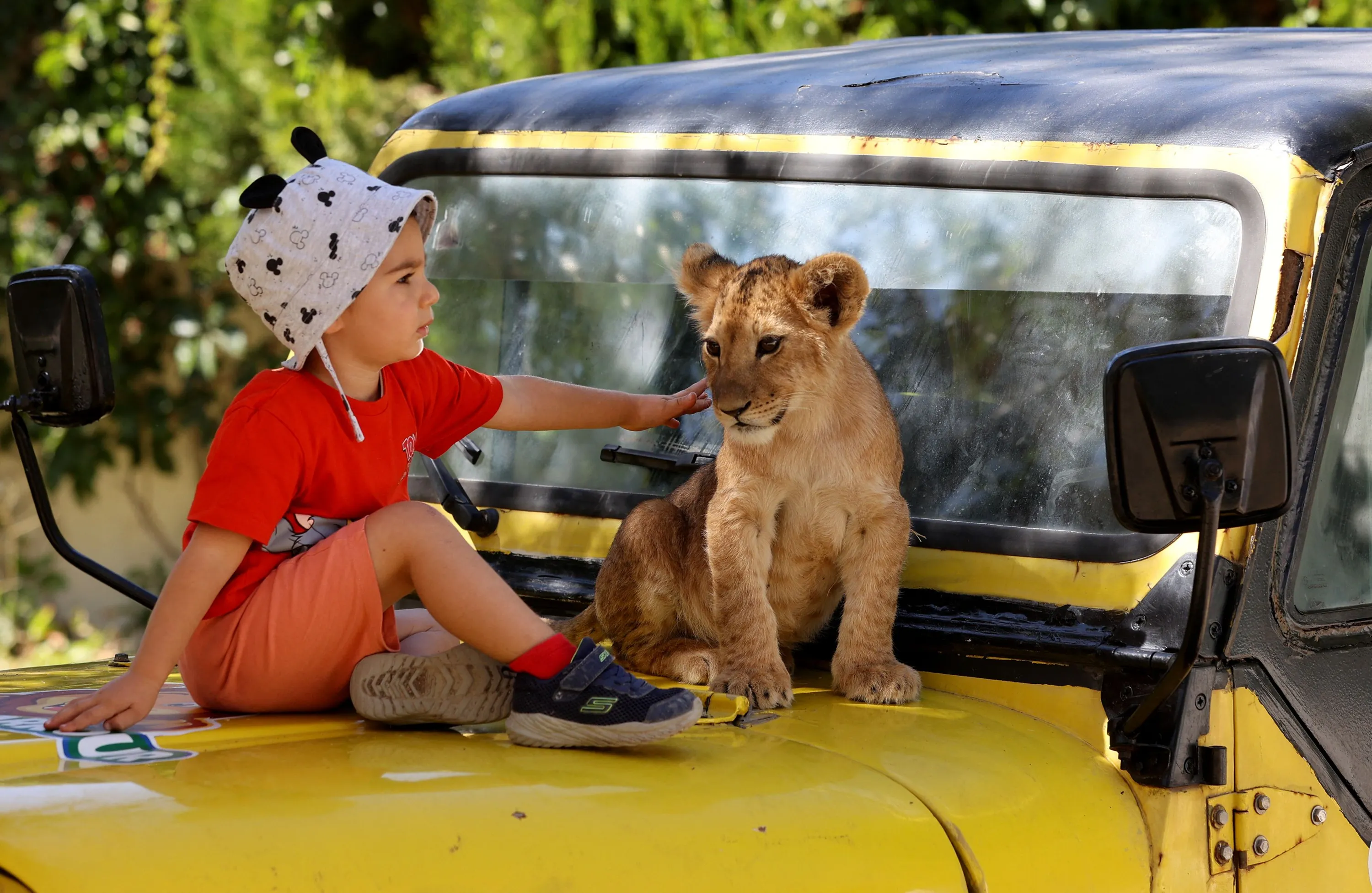 A boy plays with a 2-4 months old lion cub lying on a car hood at the “Lion Parkour” in the Golbasi district of Ankara on September 8, 2021. Lion Parkour, which is open to public visits features three adult and nince lion cubs. (Photo by Adem Altan/AFP Photo)