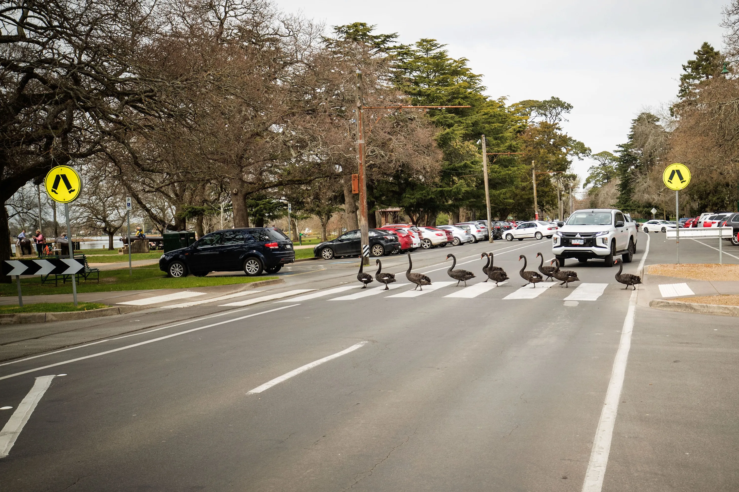 A car stops for a group of swans to cross the road at lake Wendouree on September 10, 2021 in Ballarat, Australia. (Photo by Darrian Traynor/Getty Images)