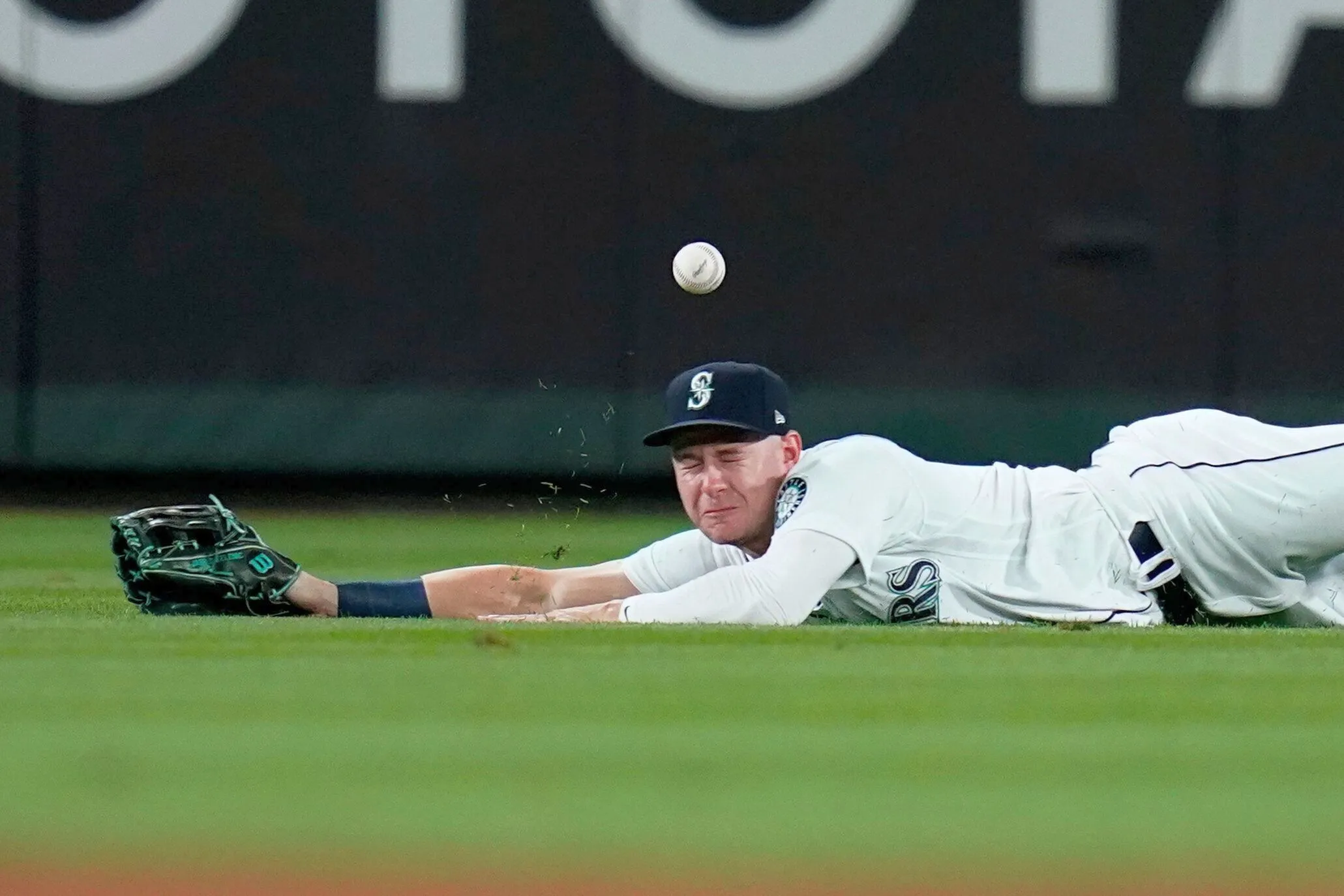 Seattle Mariners center fielder Jarred Kelenic dives for but misses the ball on a single by Boston Red Sox's Jose Iglesias during the fifth inning of a baseball game Tuesday, September 14, 2021, in Seattle. (Photo by Elaine Thompson/AP Photo)