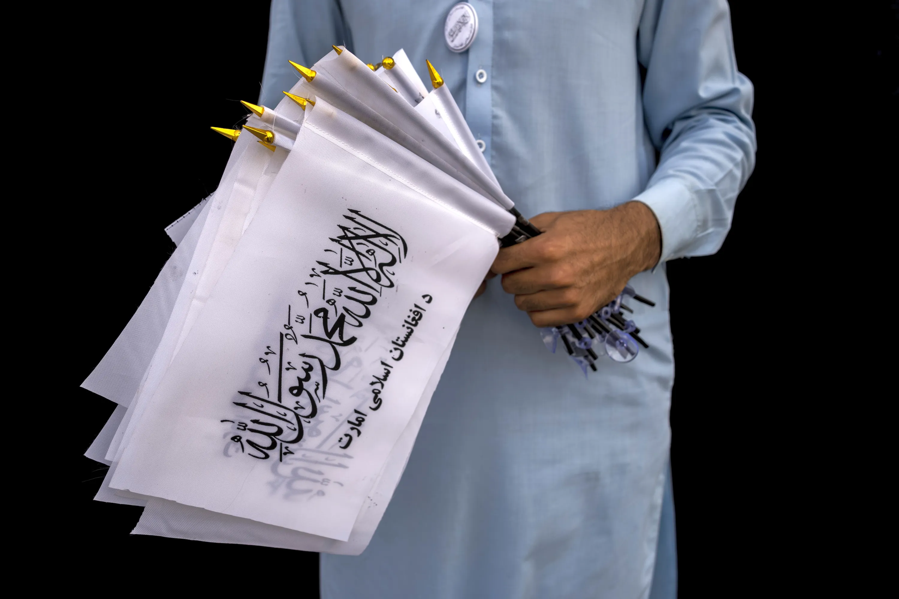 A street vendor selling Taliban flags waits for customers outside the American embassy compound in Kabul, Afghanistan, Saturday, September 11, 2021. (Photo by Bernat Armangue/AP Photo)