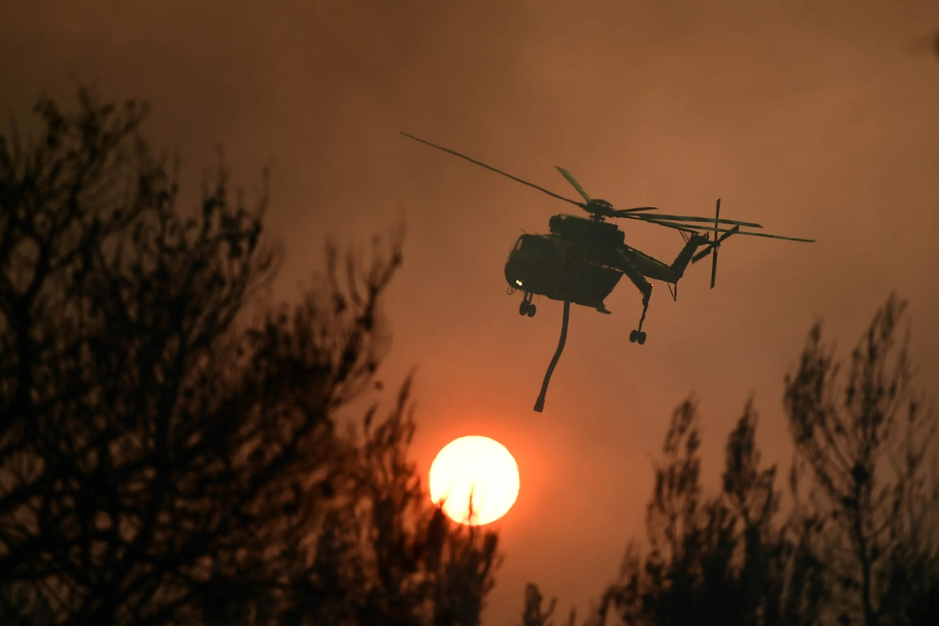 An helicopter operates during a wildfire in Kryoneri area, northern Athens, Greece, Thursday, August 5, 2021. Wildfires rekindled outside Athens and forced more evacuations around southern Greece Thursday as weather conditions worsened and firefighters in a round-the-clock battle stopped the flames just outside the birthplace of the ancient Olympics. (Photo by Michael Varaklas/AP Photo)