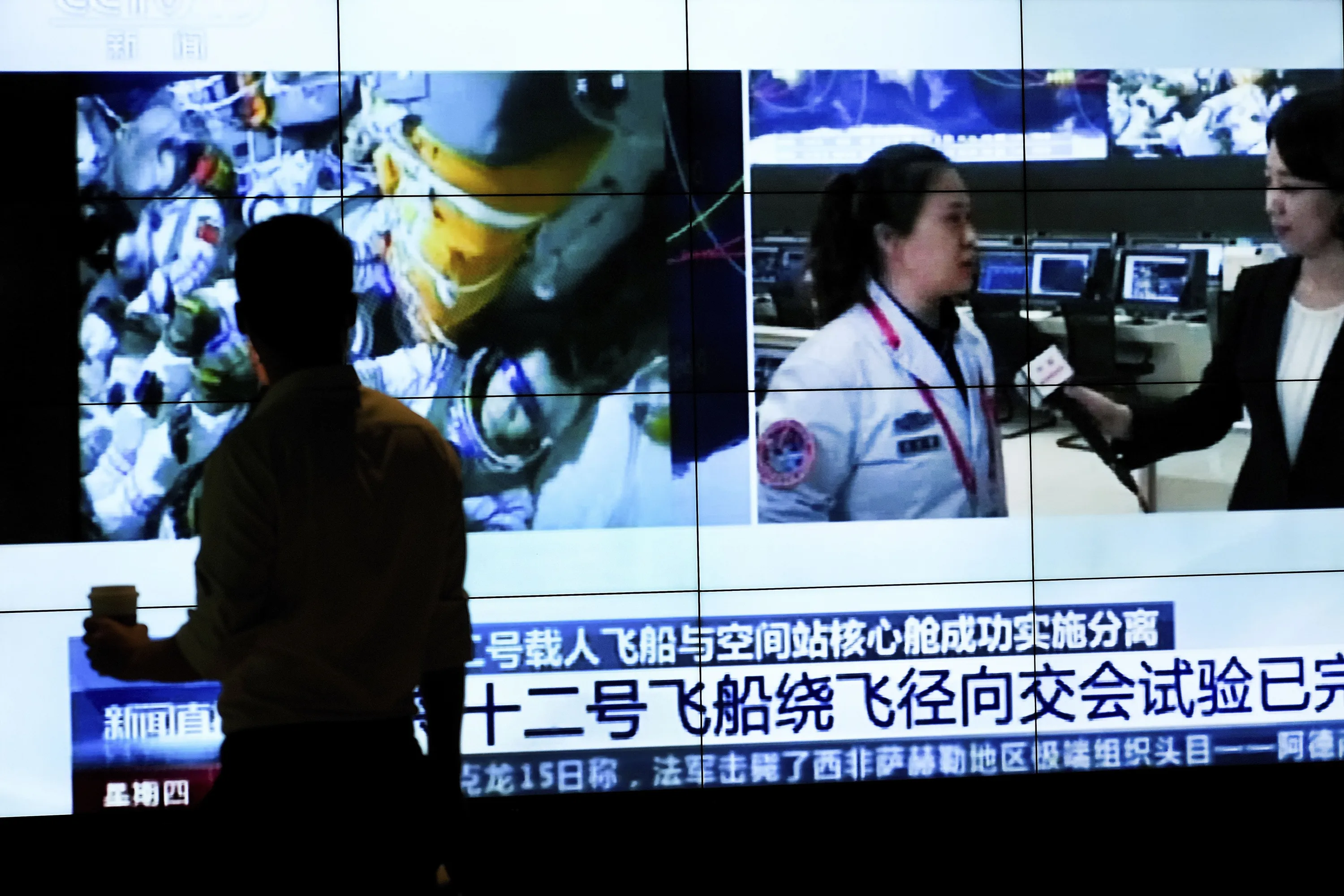 A man is silhouetted as he watches a TV screen showing CCTV broadcasting a news of Chinese astronauts sit inside the Shenzhou-12 manned spacecraft preparing to return to earth, at a shopping mall in Beijing, Thursday, September 16, 2021. (Photo by Andy Wong/AP Photo)