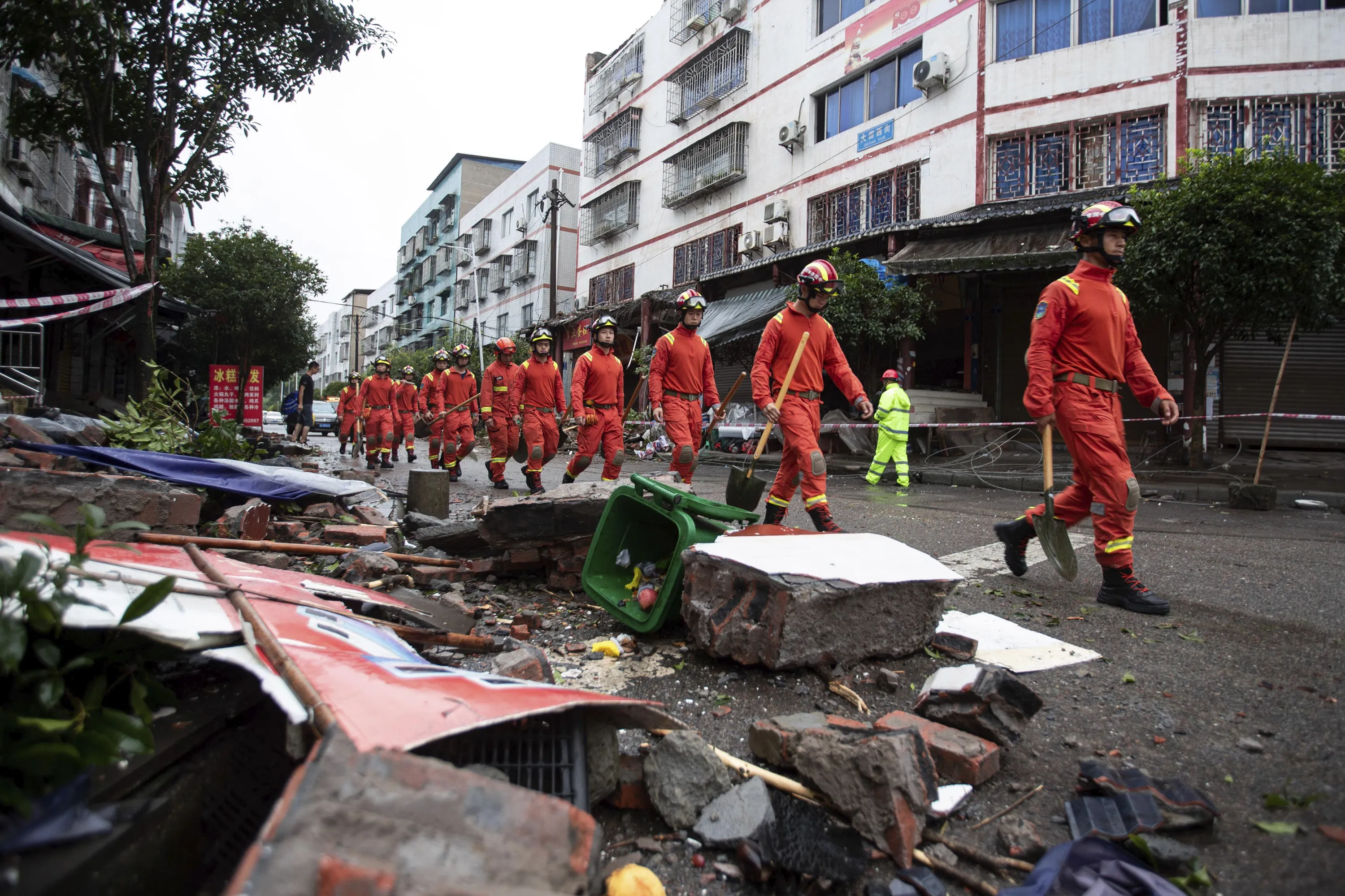 In this photo released by Xinhua News Agency, rescue workers walk near debris in the aftermath of an earthquake in Fuji Township of Luxian County in southwestern China's Sichuan Province, on Thursday, September 16, 2021.An earthquake collapsed homes, killed some and injured others Thursday in southwest China's Sichuan province, state media reported. (Photo by Jiang Hongjing/Xinhua via AP Photo)