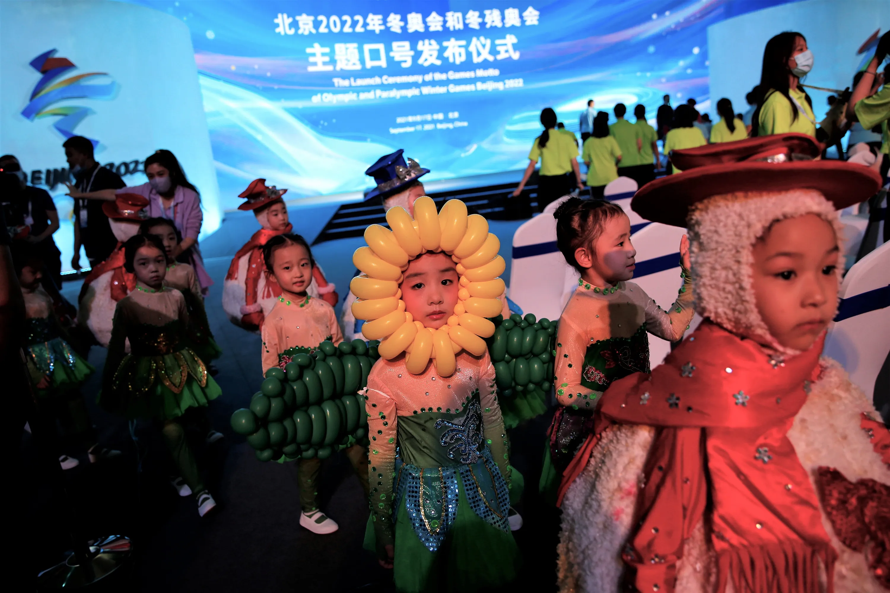 Young performers dressed in costumes leave following a ceremony unveiling the slogan for the Beijing 2022 Winter Olympic Games, in Beijing, China on September 17, 2021. (Photo by Tingshu Wang/Reuters)