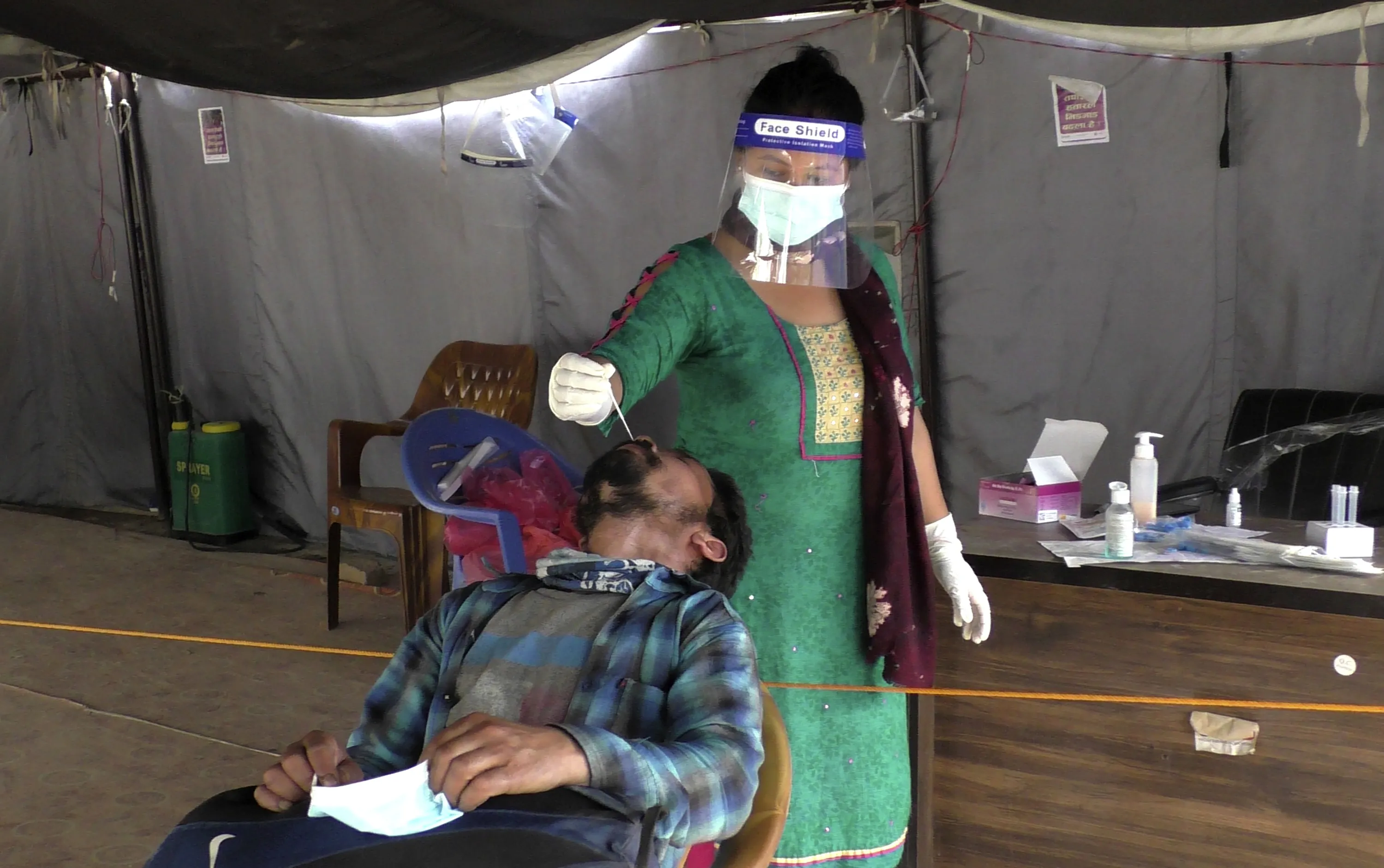 A Nepalese health worker collects a swab sample from a traveler to test for COVID-19 at Nepalgunj border town, Nepal, Wednesday, July 7, 2021. Nepal faced its own coronavirus outbreak in April which prompted authorities to impose a two-month lockdown. That brought down the number of cases, but an easing of restrictions now is raising concern about a new outbreak with so few people vaccinated. Thousands of people also cross the border with India every day without health checks to seek work there or return home. (Photo by Krishna Adhikari/AP Photo)