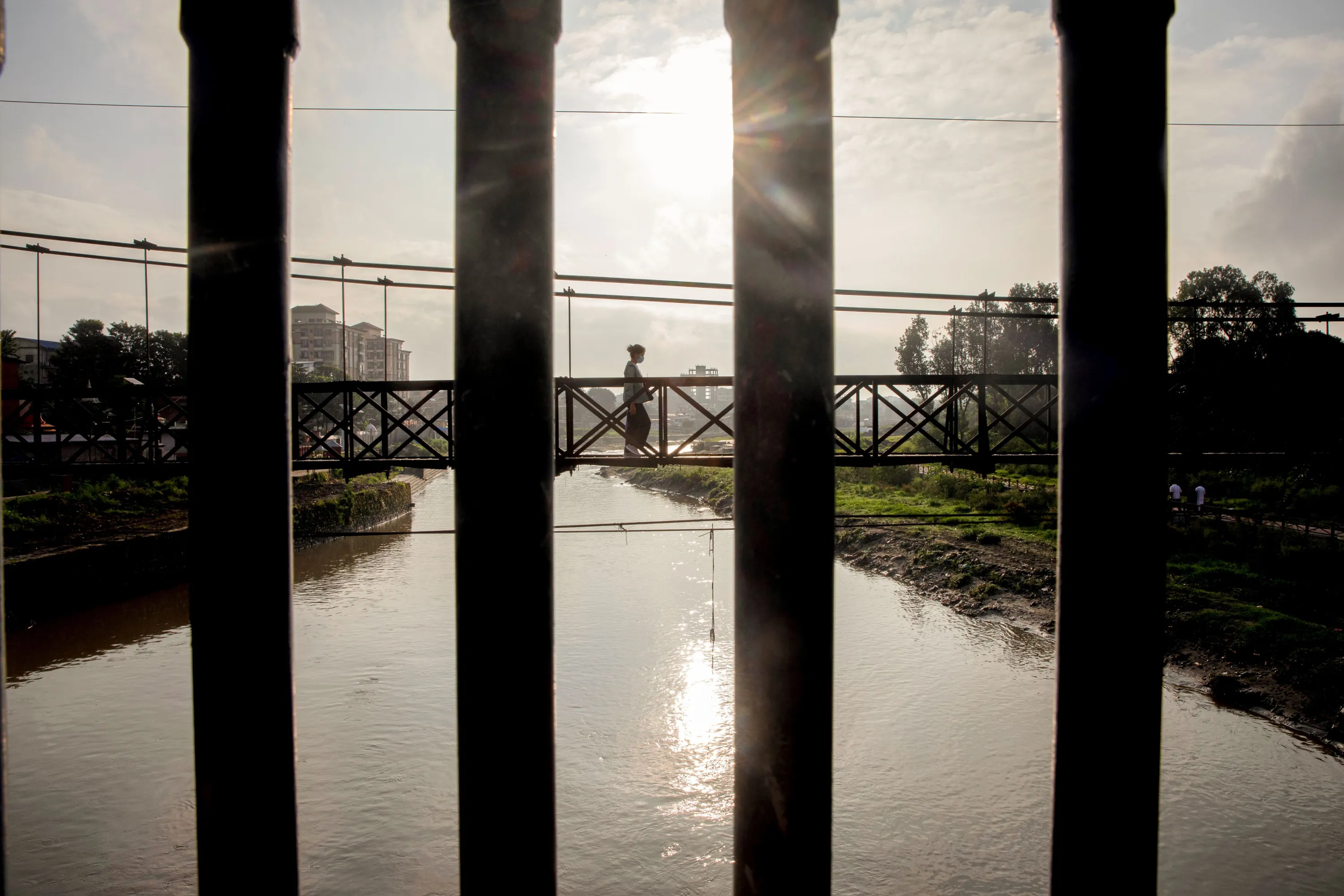 A person crosses a suspension bridge in an early morning in Kathmandu, Nepal, 10 August 2021. (Photo by Narendra Shrestha/EPA/EFE)