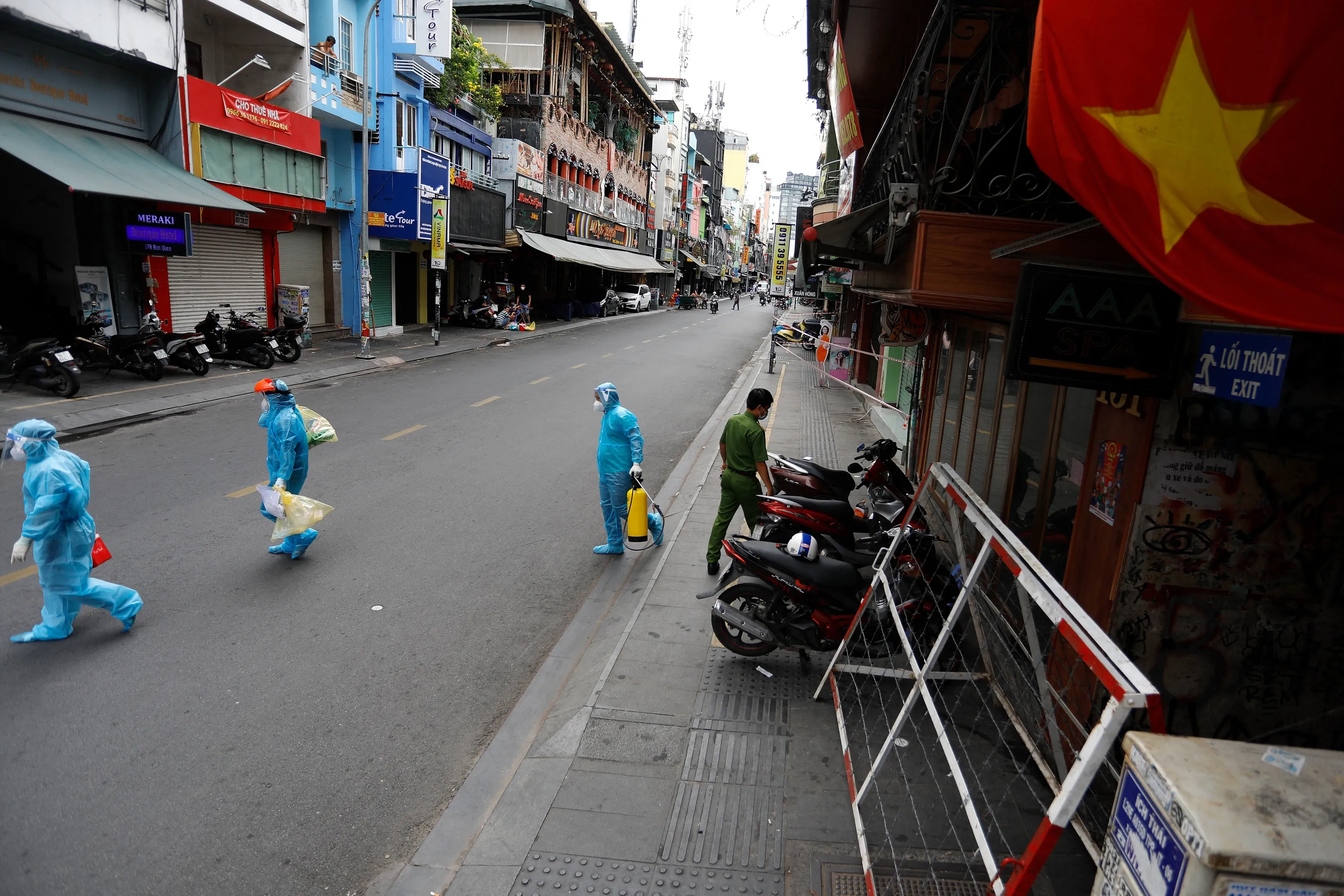 Medical workers collecting test samples from residents walk past in Ho Chi Minh City on July 9, 2021, on the first day of the government imposed two-week lockdown as a preventive measure to stop the spread of the COVID-19 coronavirus. (Photo by Huu Khoa/AFP Photo)