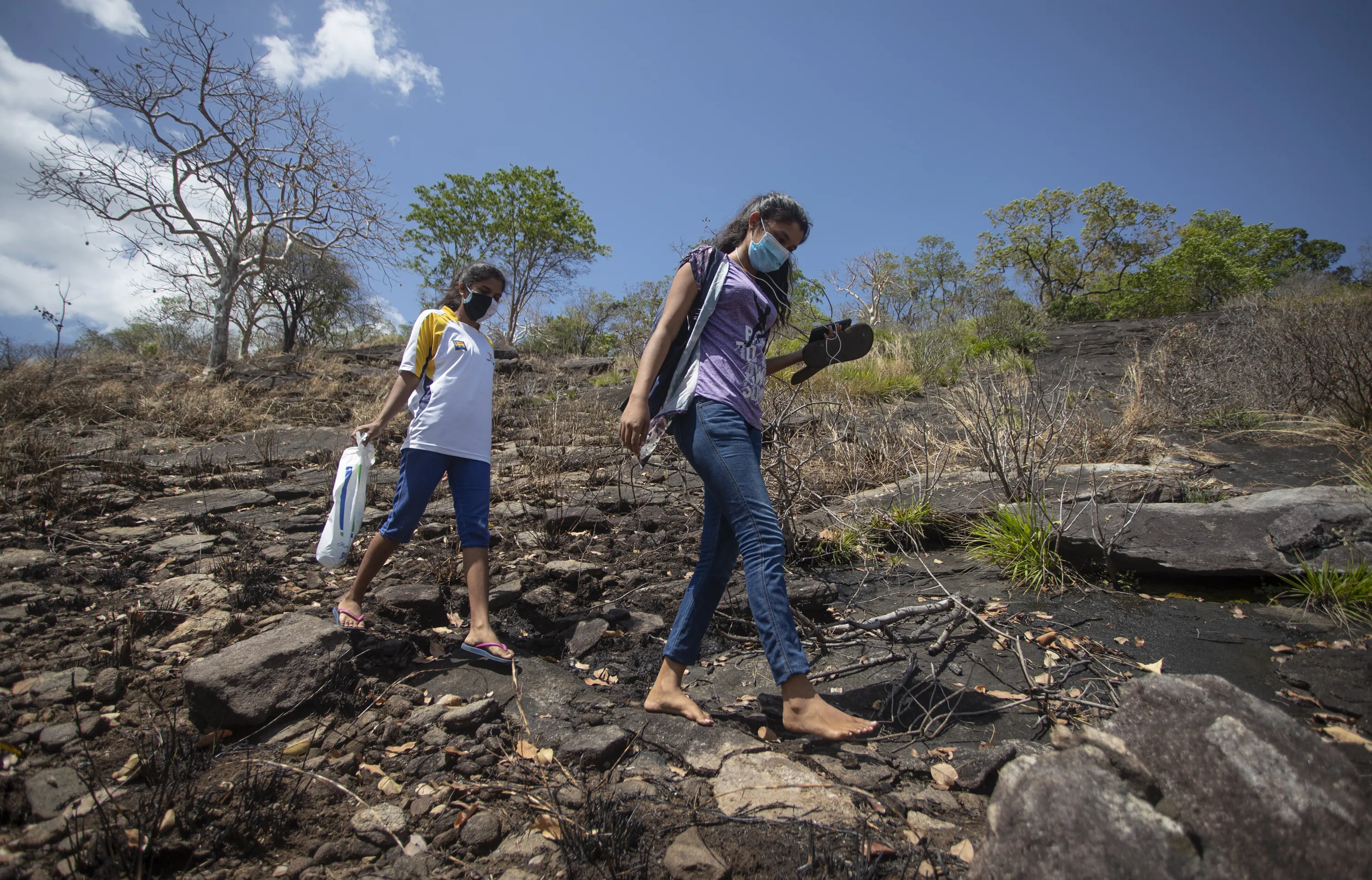 Sri Lankan students walk down a mountain after attending their online lessons in a forest reserve in Bohitiyawa village in Meegahakiwula, Sri Lanka, July 2, 2021. (Photo by Eranga Jayawardena/AP Photo)