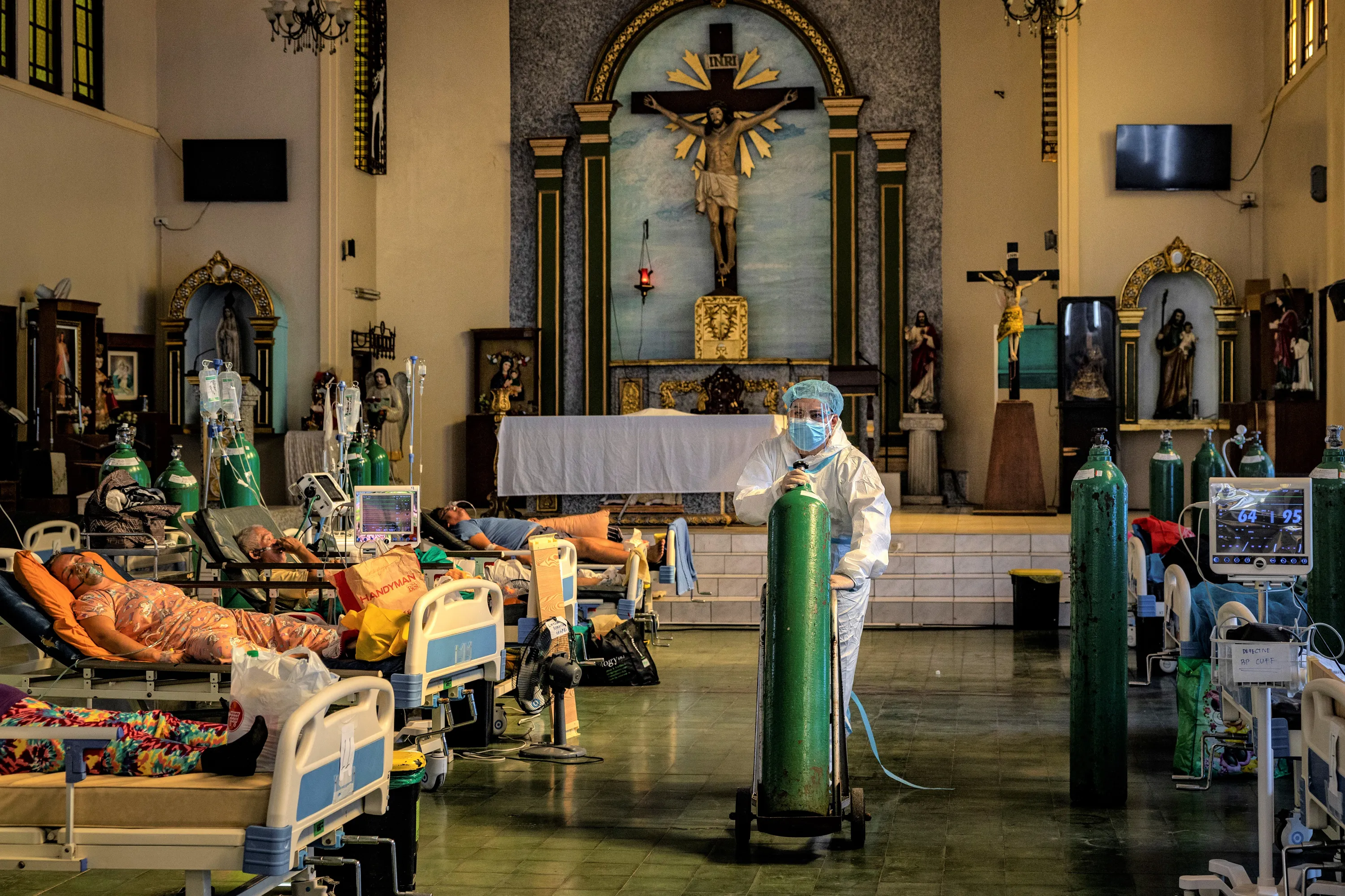 A healthcare worker moves an oxygen tank as patients infected with Covid-19 are treated at a chapel converted into a Covid-19 intensive care unit on August 25, 2021 in Quezon city, Metro Manila, Philippines. Hospitals in the Philippines are running out of beds for Covid-19 patients as the country struggles to cope with a huge wave of cases fueled by the more infectious Delta variant. Recording more than 1.8 million cases and more than 32,000 deaths, the Philippines continues to suffer the second-worst outbreak of the pandemic in Southeast Asia, with every one out of four people tested turning out positive for the coronavirus. (Photo by Ezra Acayan/Getty Images)