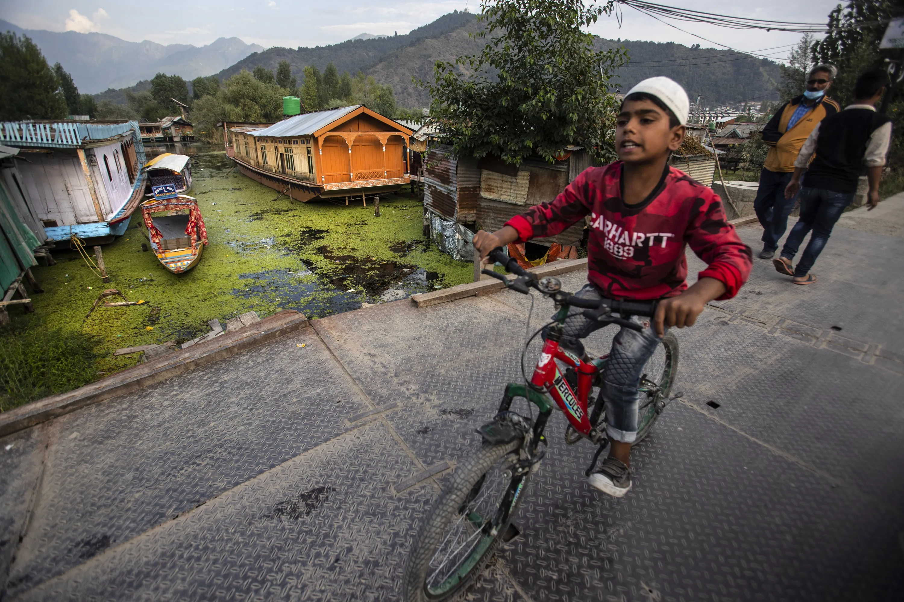 A Kashmiri child crosses a bridge over the Dal Lake in Srinagar, Indian controlled Kashmir, Saturday, August 28, 2021. (Photo by Mukhtar Khan/AP Photo)
