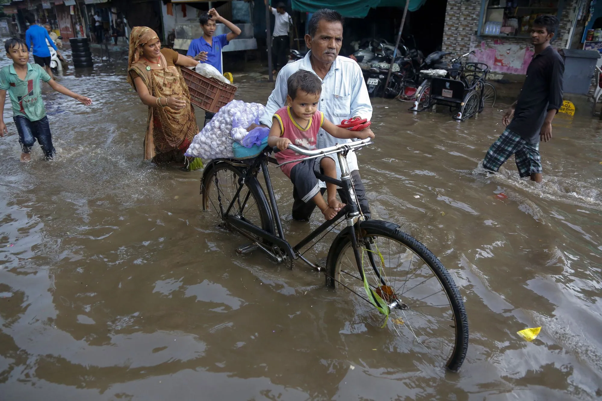 People wade through a water logged road after rain in Ahmedabad, India, Monday, September 20, 2021. (Photo by Ajit Solanki/AP Photo)