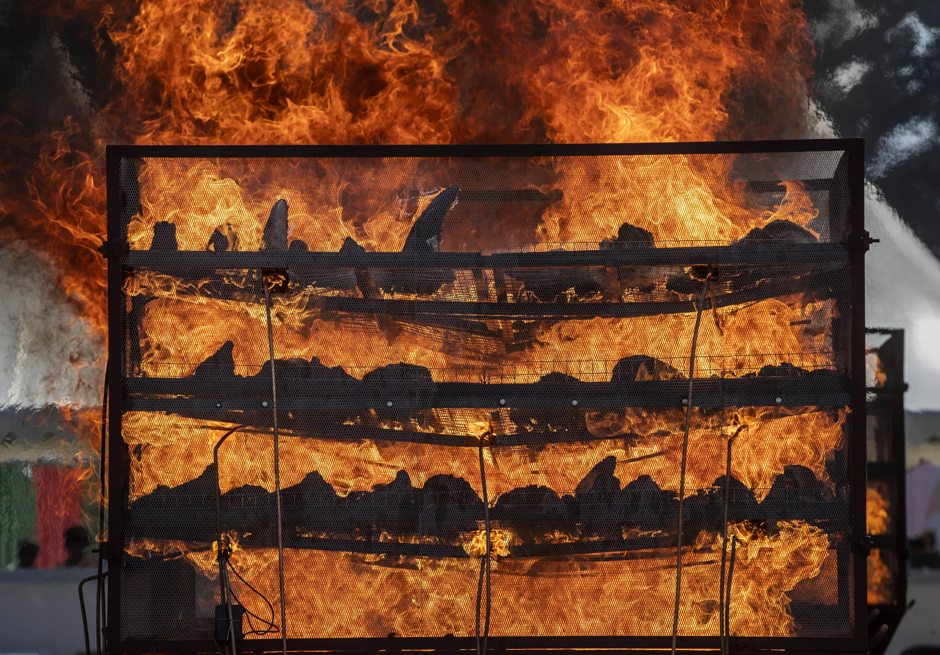 Thousands of rhino horns kept in government custody for decades are burned at an event to mark World Rhino Day in Bokakhat near Kaziranga National Park, north-eastern Assam state, India, Wednesday, September 22, 2021. (Photo by Anupam Nath/AP Photo)