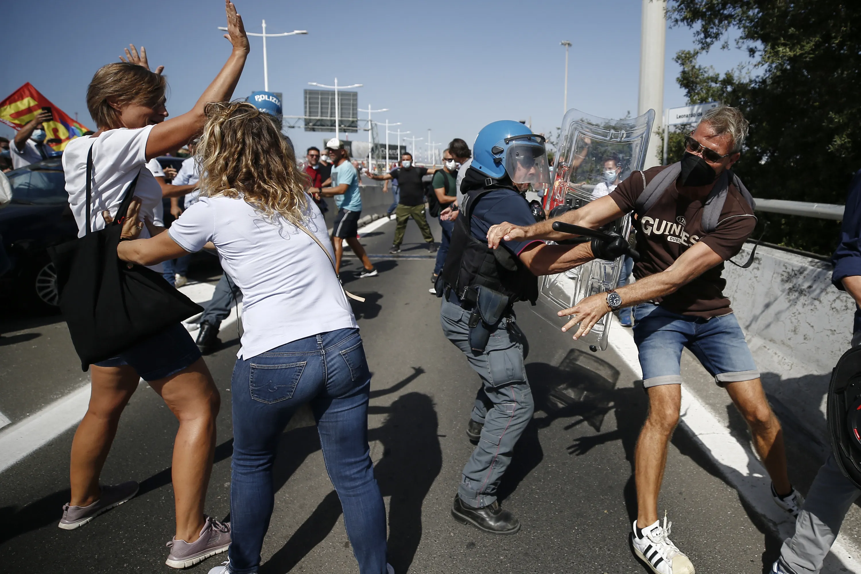 Police face Alitalia workers after they blocked the highway leading to the Rome Leonardo Da Vinci international airport following a protest in Fiumicino, Friday, September 24, 2021. Alitalia, which has been in the red for more than a decade, is due to formally exit the airline market next month and be replaced by a new national carrier ITA, or Italy Air Transport. The European Commission has given the go-ahead to a 1.35 billion euro ($1.58 billion) injection of government funding into the new airline, but ITA is only planning to hire around a quarter of the estimated 10,000 Alitalia employees. (Photo by Cecilia Fabiano/LaPresse via AP Photo)