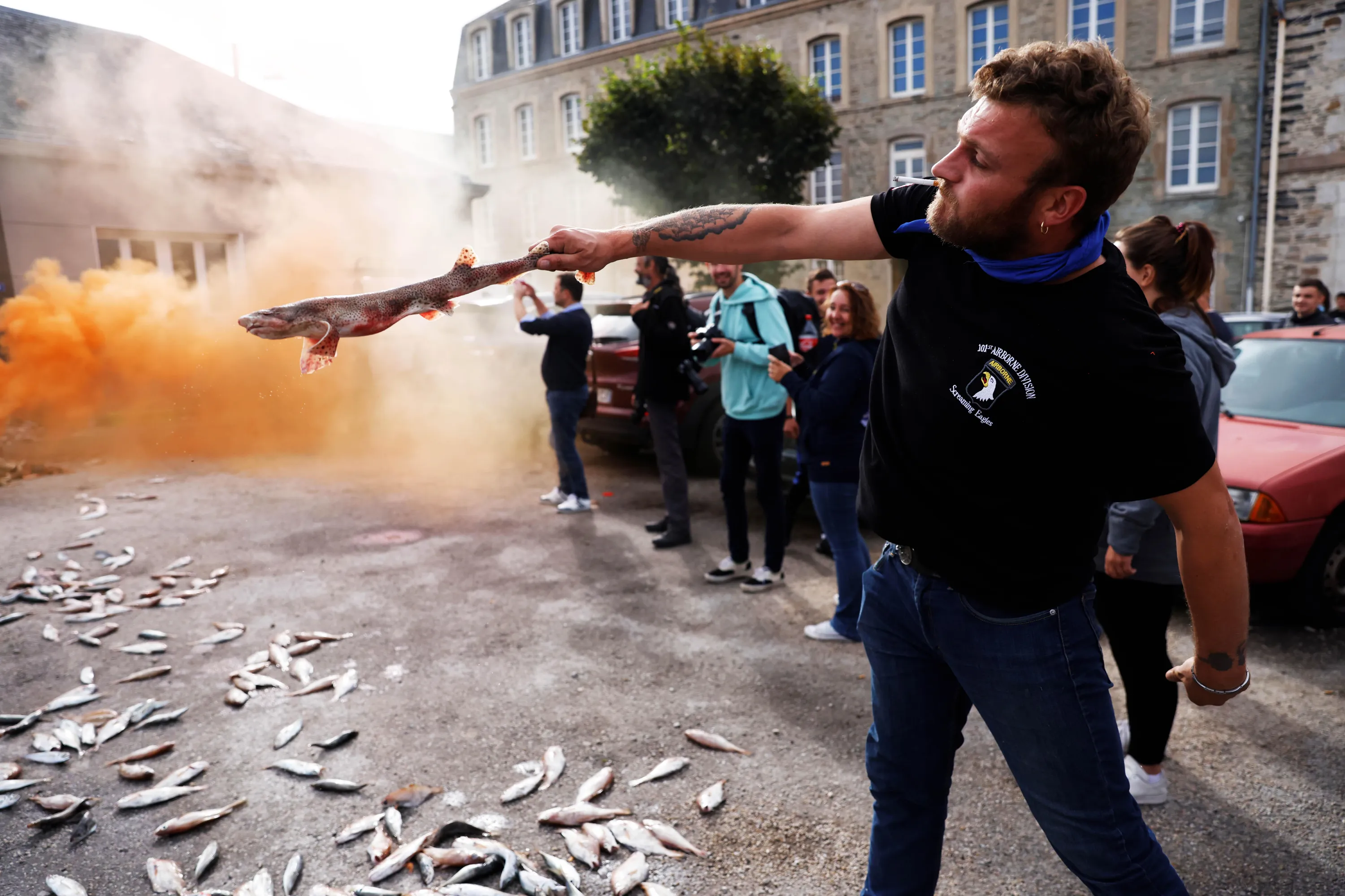 French fishermen throw fish in front of the Regional Committee for Maritime Fisheries building during a protest against offshore wind turbines projects following the call for a national mobilisation launched by the Citizens of the Seas collective, in the port of Cherbourg-en-Cotentin, France, September 24, 2021. (Photo by Stephane Mahe/Reuters)