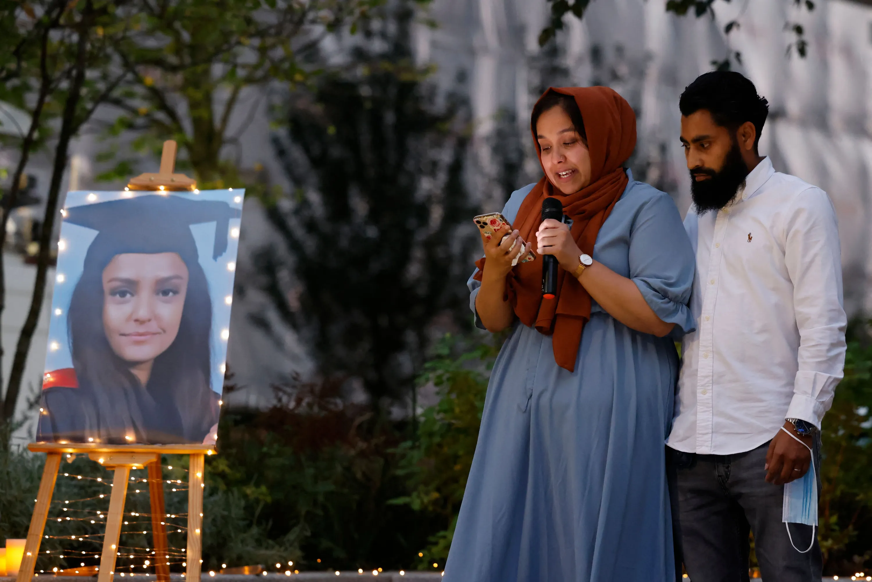 Jebina Nessa (L) pays tribute to her sister during a vigil for 28 year-old teacher Sabina Nessa, whose body was found near the Onespace community centre, at Pegler Square, Kidbrooke in south east London on September 24, 2021. (Photo by Tolga Akmen/AFP Photo)