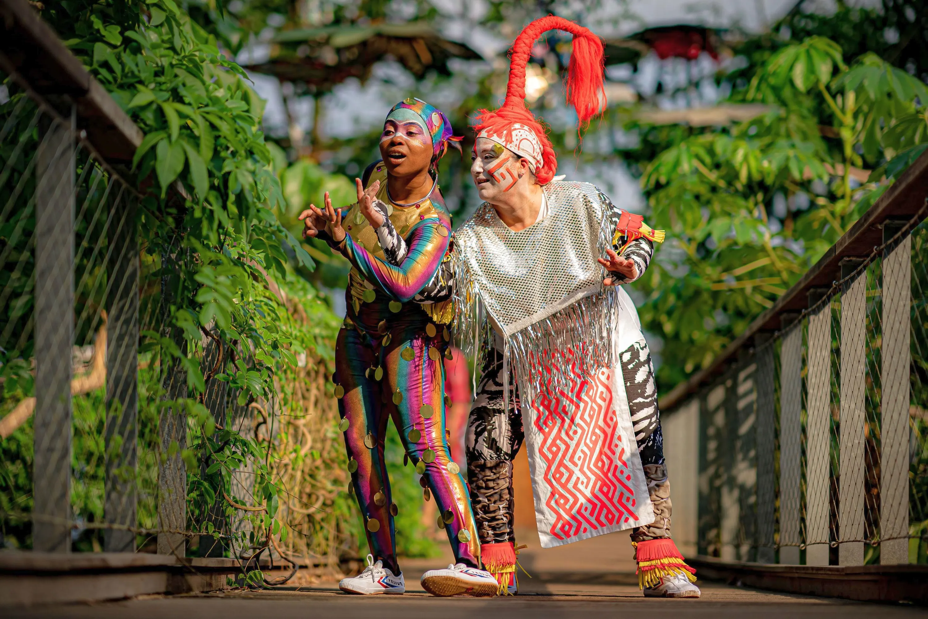 Artists rehearse an artistic performance routine inside the tropical rainforest biome at the Eden Project in Cornwall on July 12, 2021, where their summer programme of poetry, performance and art is gearing up to begin on the 19th of July, coinciding with the removal of coronavirus restrictions. (Photo by Ben Birchall/PA Images via Getty Images)