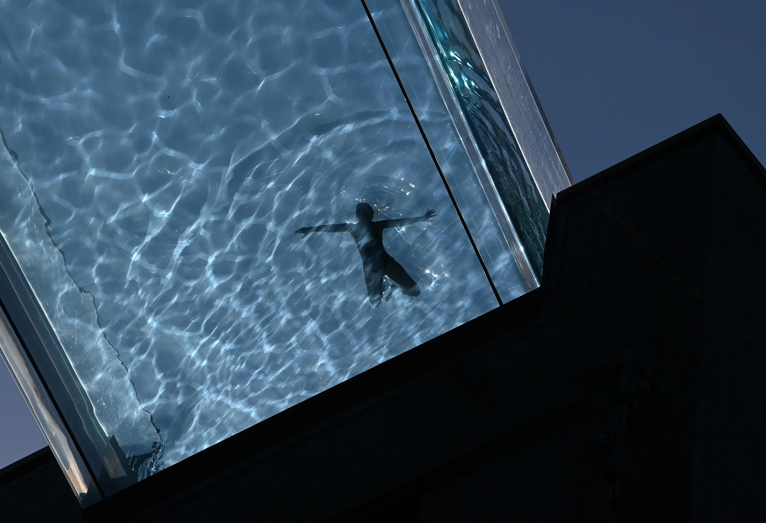 A person relaxes during hot weather at the Embassy Gardens Sky Pool, a transparent acrylic swimming pool suspended between two buildings, in London, Britain, September 7, 2021. (Photo by Toby Melville/Reuters)